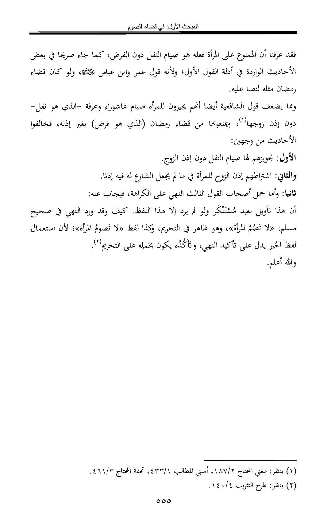 ومما يضعف قول الشافعية أيضا أنهم يجيزون للمرأة صيام عاشوراء وعرفة -الذي هو نفل- دون إذن زوجها (¬1)، ويمنعونها من قضاء رمضان (الذي هو فرض) بغير إذنه، فخالفوا الأحاديث من وجهين: