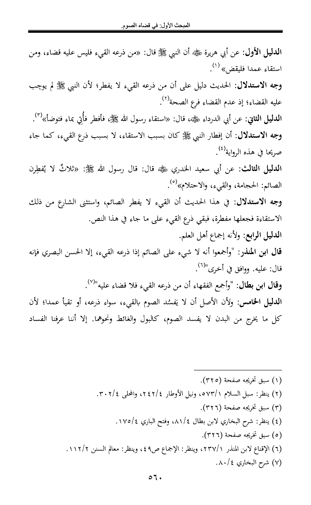 وجه الاستدلال: في هذا الحديث أن القيء لا يفطر الصائم، واستثنى الشارع من ذلك الاستقاءة فجعلها مفطرة، فبقي ذرع القيء على ما جاء في هذا النص.