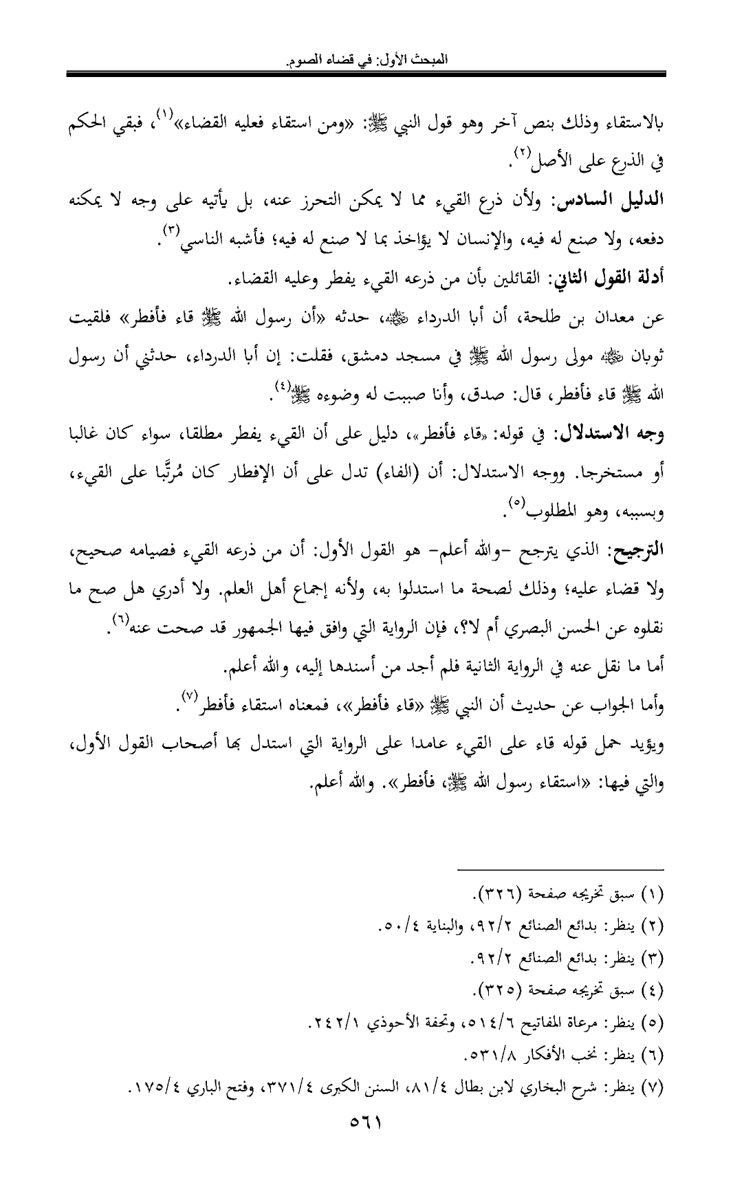 ويؤيد حمل قوله قاء على القيء عامدا على الرواية التي استدل بها أصحاب القول الأول, والتي فيها: «استقاء رسول الله - صلى الله عليه وسلم -، فأفطر». والله أعلم.