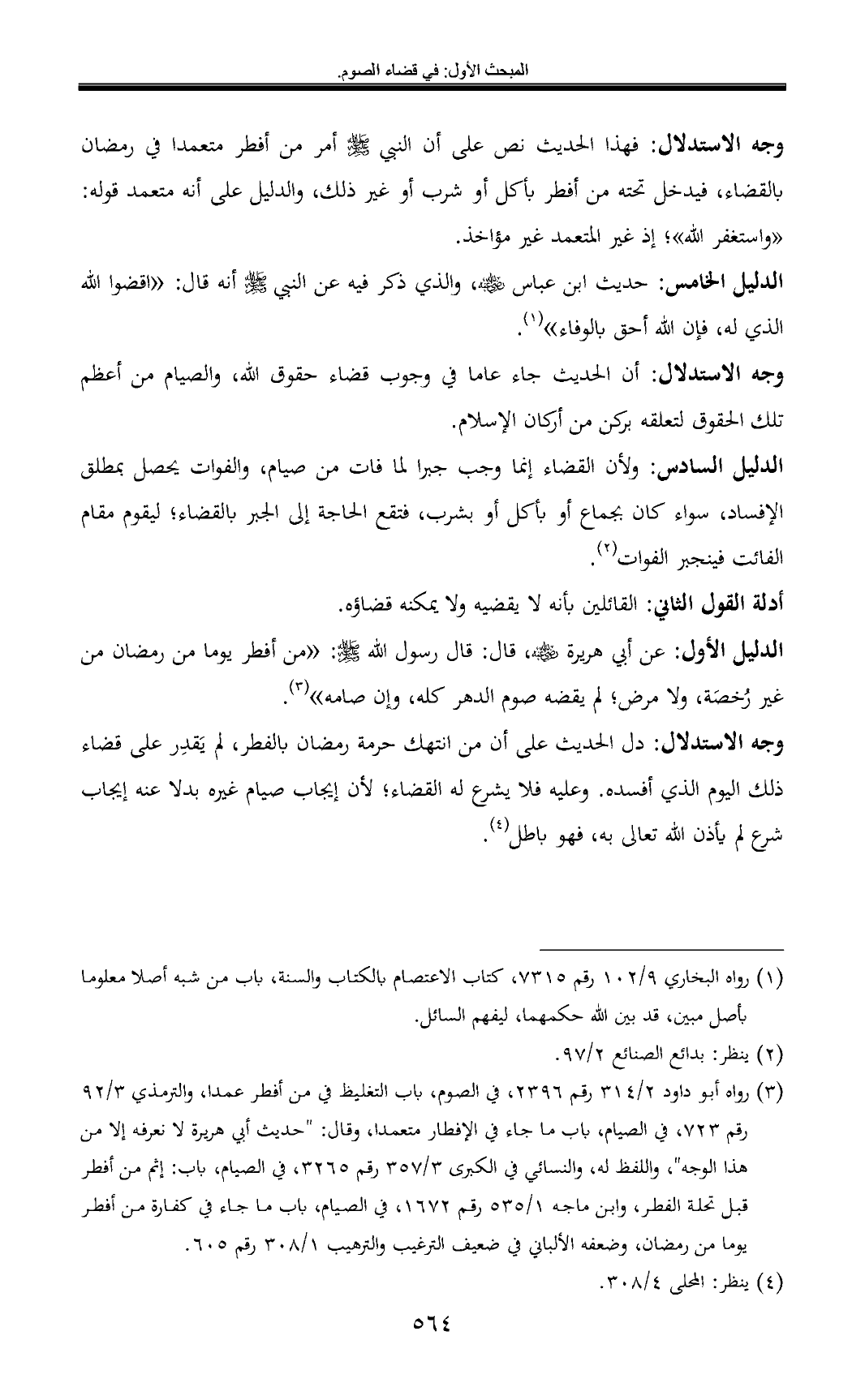 الدليل الأول: عن أبي هريرة - رضي الله عنه -، قال: قال رسول الله - صلى الله عليه وسلم -: «من أفطر يوما من رمضان من غير رُخصَة، ولا مرض؛ لم يقضه صوم الدهر كله، وإن صامه» (¬3).