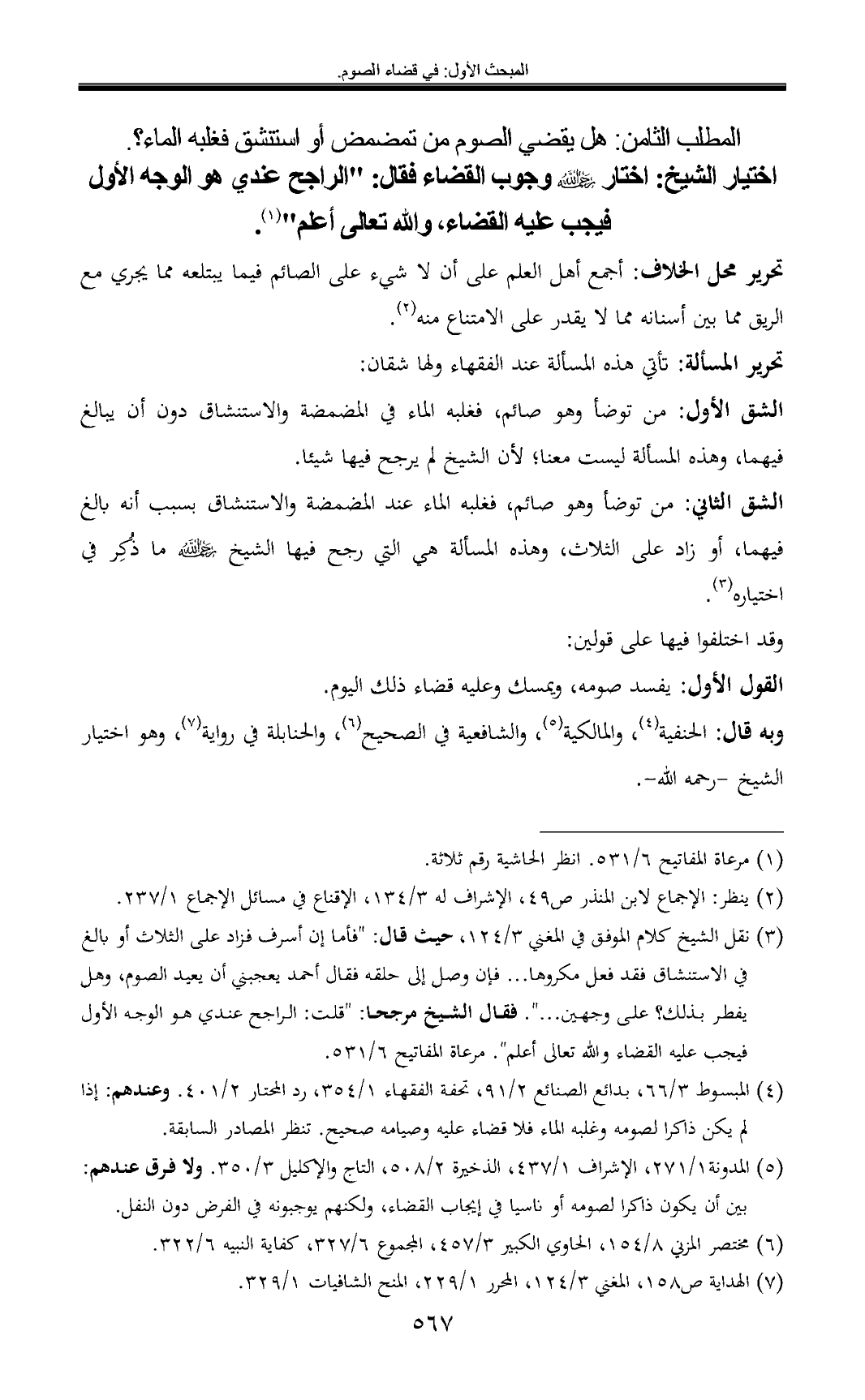 (¬3) نقل الشيخ كلام الموفق في المغني 3/ 124, حيث قال: "فأما إن أسرف فزاد على الثلاث أو بالغ في الاستنشاق فقد فعل مكروها ... فإن وصل إلى حلقه فقال أحمد يعجبني أن يعيد الصوم، وهل يفطر بذلك؟ على وجهين ... ". فقال الشيخ مرجحا: "قلت: الراجح عندي هو الوجه الأول فيجب عليه القضاء والله تعالى أعلم". مرعاة المفاتيح 6/ 531.