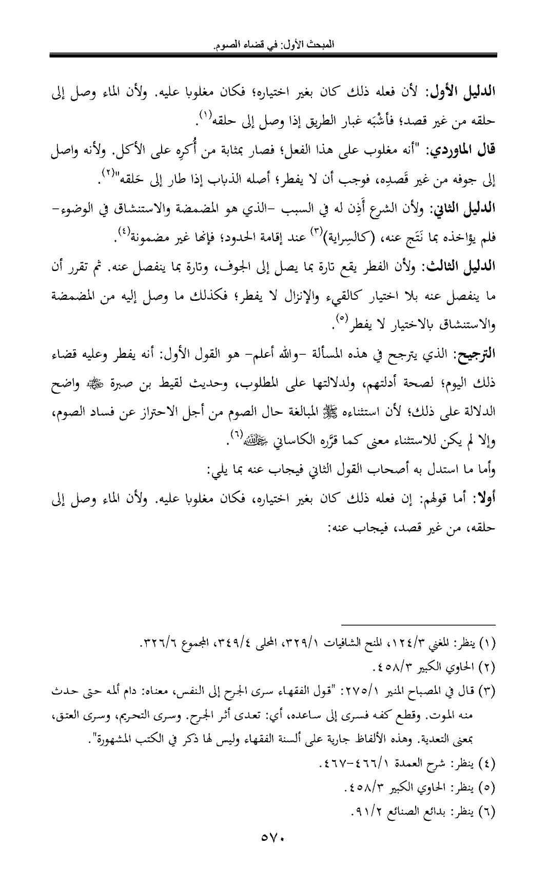 أولا: أما قولهم: إن فعله ذلك كان بغير اختياره، فكان مغلوبا عليه. ولأن الماء وصل إلى حلقه، من غير قصد، فيجاب عنه: