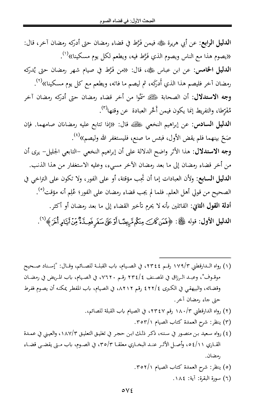 الدليل السادس: عن إبراهيم النخعي قال: «إذا تتابع عليه رمضانان صامهما. فإن صَحّ بينهما فلم يقض الأول، فبئس ما صنع، فليستغفر الله وليصم» (¬4).