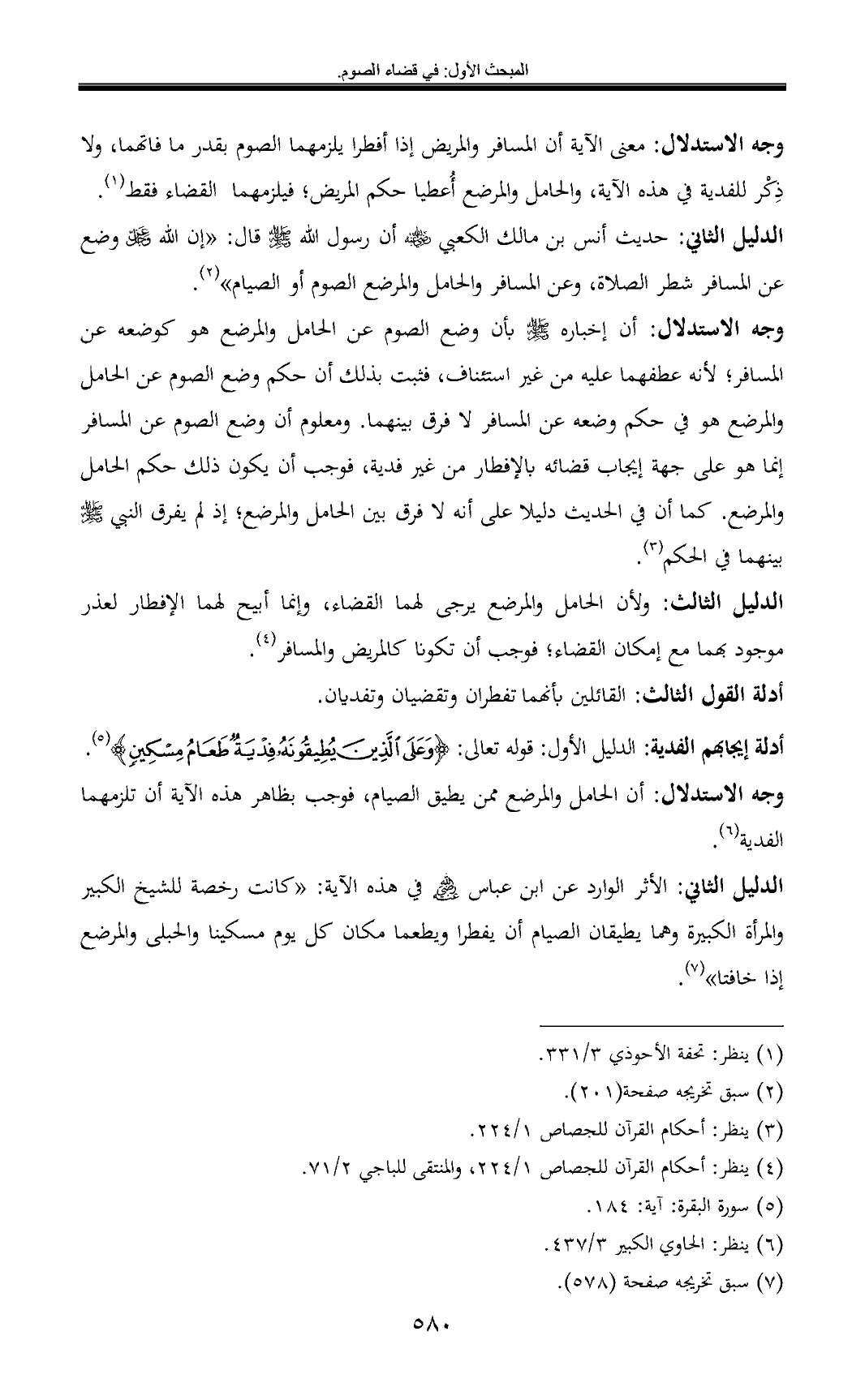وجه الاستدلال: أن إخباره - صلى الله عليه وسلم - بأن وضع الصوم عن الحامل والمرضع هو كوضعه عن المسافر؛ لأنه عطفهما عليه من غير استئناف، فثبت بذلك أن حكم وضع الصوم عن الحامل والمرضع هو في حكم وضعه عن المسافر لا فرق بينهما. ومعلوم أن وضع الصوم عن المسافر إنما هو على جهة إيجاب قضائه بالإفطار من غير فدية، فوجب أن يكون ذلك حكم الحامل والمرضع. كما أن في الحديث دليلا على أنه لا فرق بين الحامل والمرضع؛ إذ لم يفرق النبي - صلى الله عليه وسلم - بينهما في الحكم (¬3).