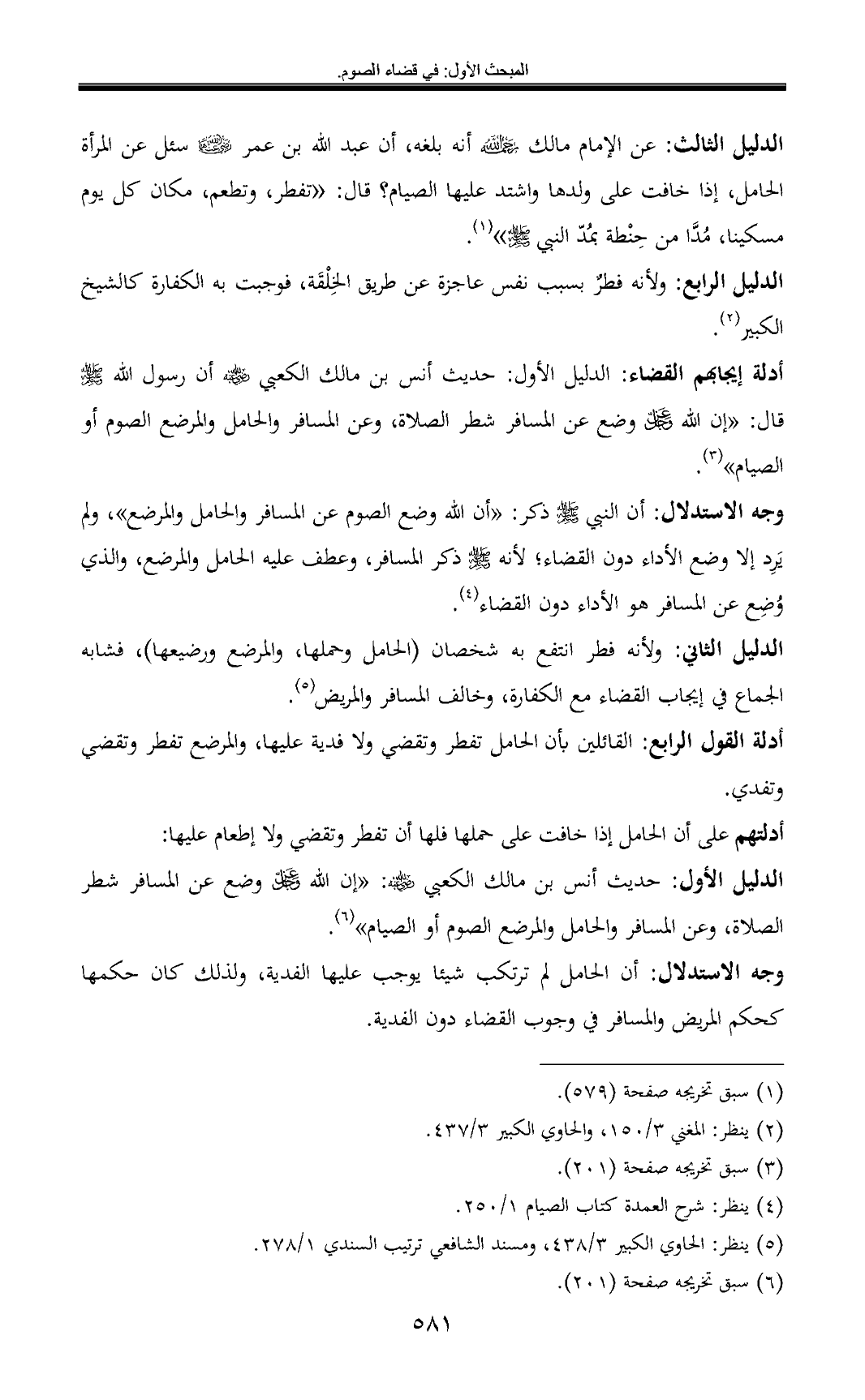 أدلة إيجابهم القضاء: الدليل الأول: حديث أنس بن مالك الكعبي - رضي الله عنه - أن رسول الله - صلى الله عليه وسلم - قال: «إن الله عز وجل وضع عن المسافر شطر الصلاة، وعن المسافر والحامل والمرضع الصوم أو الصيام» (¬3).