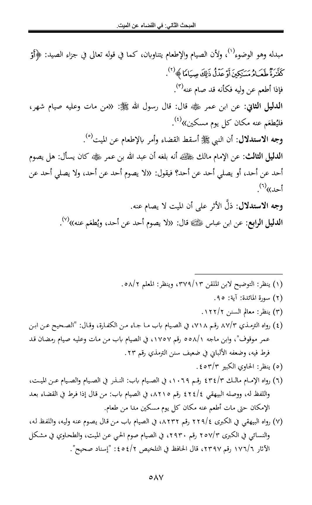 الدليل الثاني: عن ابن عمر - رضي الله عنه - قال: قال رسول الله - صلى الله عليه وسلم -: «من مات وعليه صيام شهر، فليُطعَم عنه مكان كل يوم مسكين» (¬4).