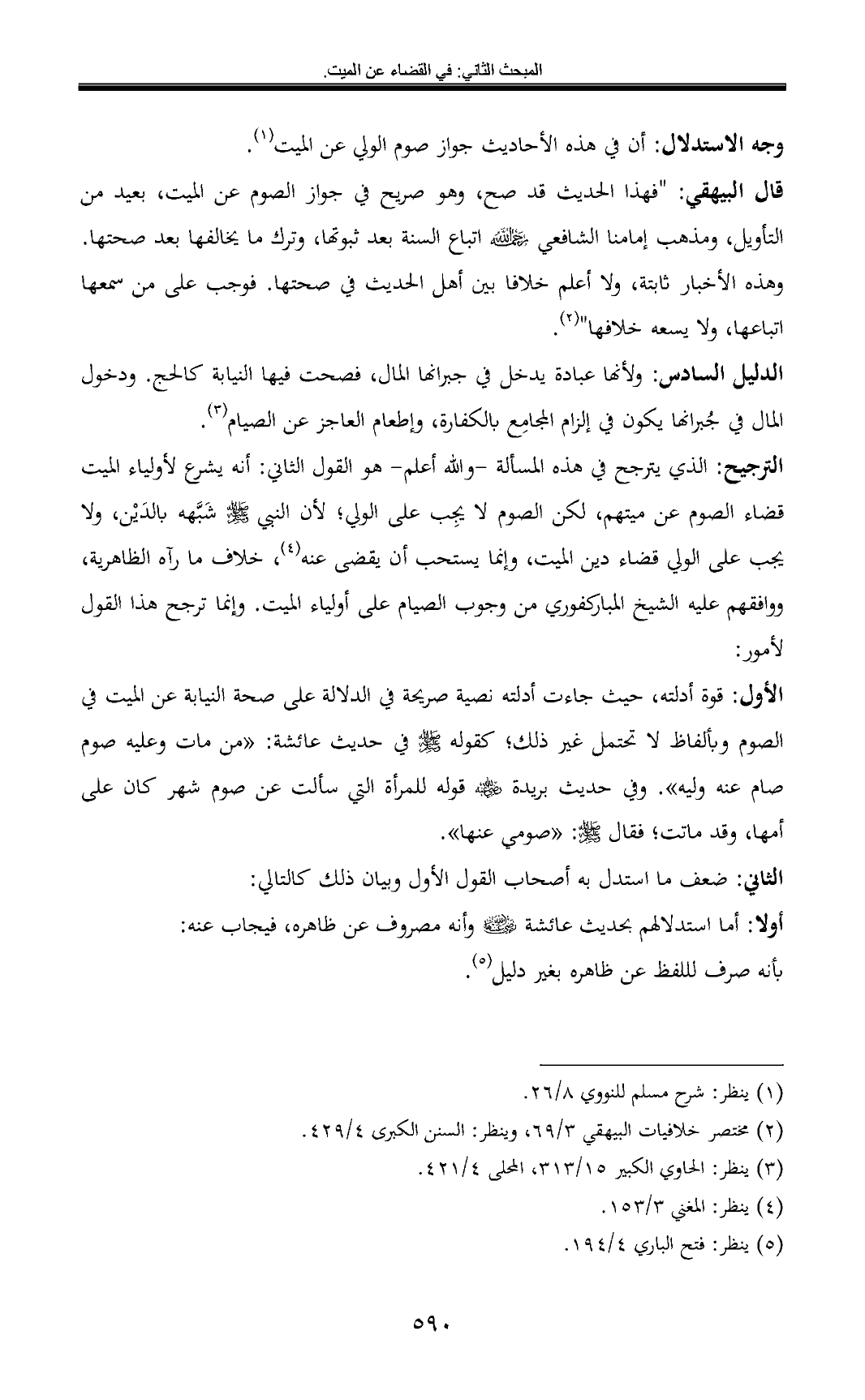 الترجيح: الذي يترجح في هذه المسألة -والله أعلم- هو القول الثاني: أنه يشرع لأولياء الميت قضاء الصوم عن ميتهم، لكن الصوم لا يجِب على الولي؛ لأن النبي - صلى الله عليه وسلم - شَبَّهه بالدَيْن، ولا يجب على الولي قضاء دين الميت، وإنما يستحب أن يقضى عنه (¬4)، خلاف ما رآه الظاهرية, ووافقهم عليه الشيخ المباركفوري من وجوب الصيام على أولياء الميت. وإنما ترجح هذا القول لأمور: