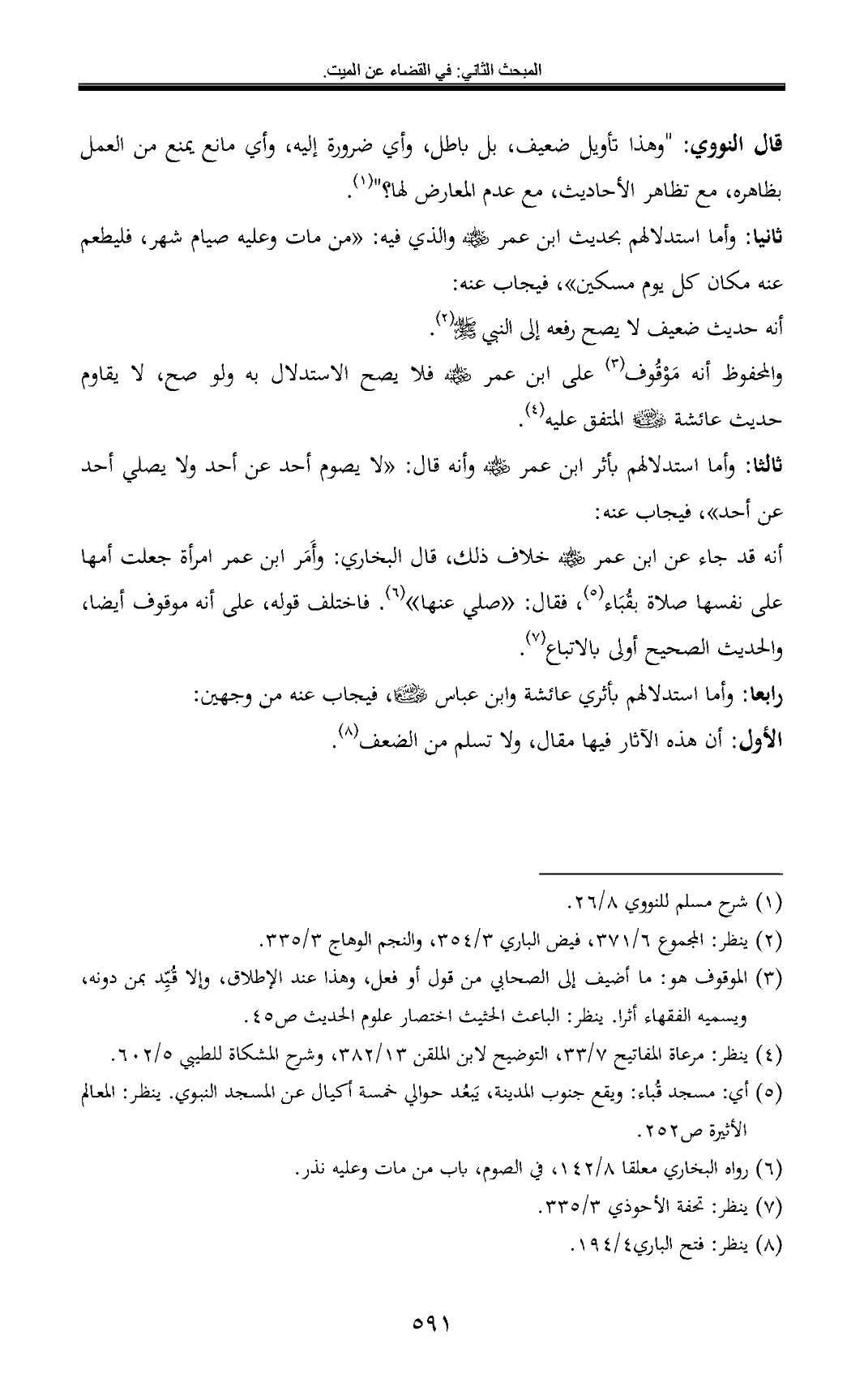 ثانيا: وأما استدلالهم بحديث ابن عمر - رضي الله عنه - والذي فيه: «من مات وعليه صيام شهر، فليطعم عنه مكان كل يوم مسكين» , فيجاب عنه: