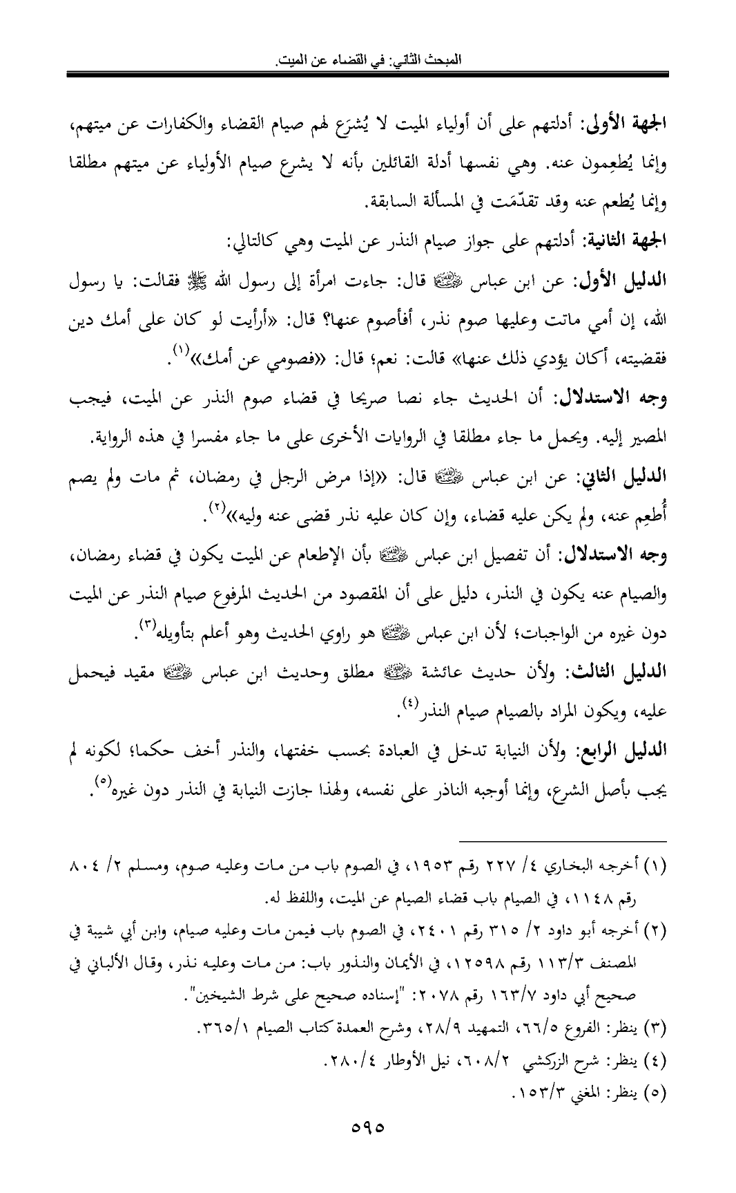 الجهة الثانية: أدلتهم على جواز صيام النذر عن الميت وهي كالتالي: