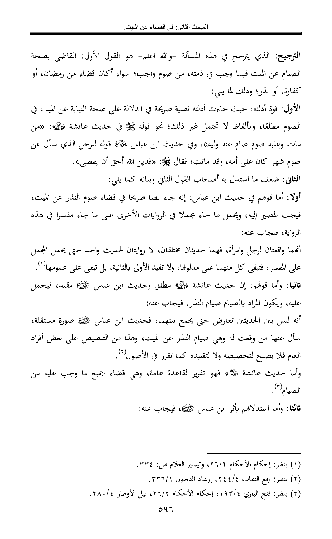 ثانيا: وأما قولهم: إن حديث عائشة - رضي الله عنها - مطلق وحديث ابن عباس - رضي الله عنهما - مقيد، فيحمل عليه، ويكون المراد بالصيام صيام النذر, فيجاب عنه: