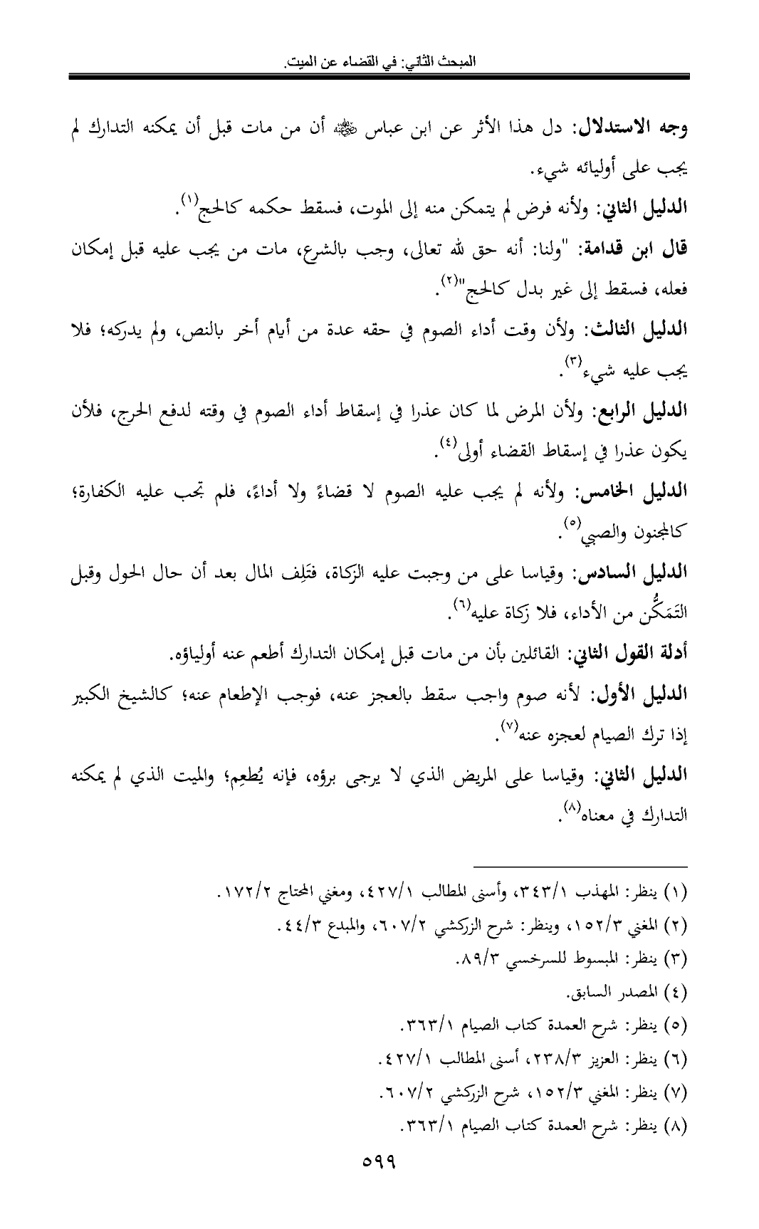 وجه الاستدلال: دل هذا الأثر عن ابن عباس - رضي الله عنه - أن من مات قبل أن يمكنه التدارك لم يجب على أوليائه شيء.