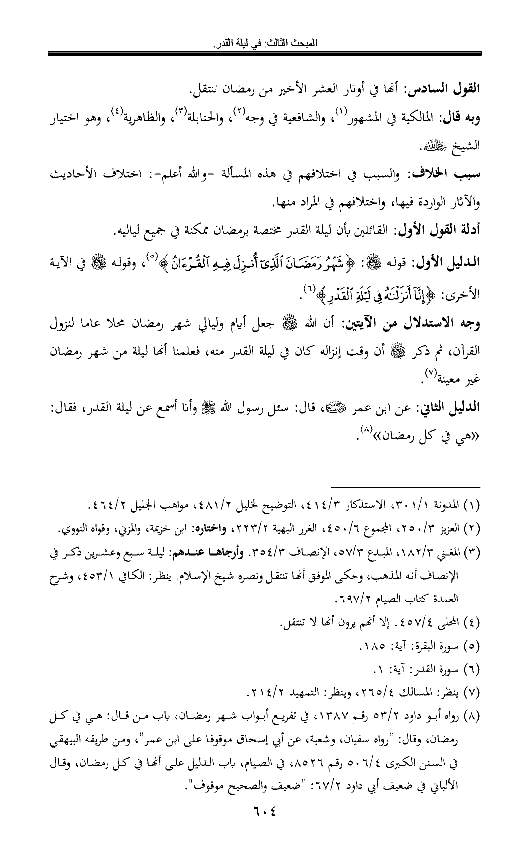 (¬3) المغني 3/ 182, المبدع 3/ 57, الإنصاف 3/ 354. وأرجاها عندهم: ليلة سبع وعشرين ذكر في الإنصاف أنه المذهب، وحكى الموفق أنها تنتقل ونصره شيخ الإسلام. ينظر: الكافي 1/ 453, وشرح العمدة كتاب الصيام 2/ 697.