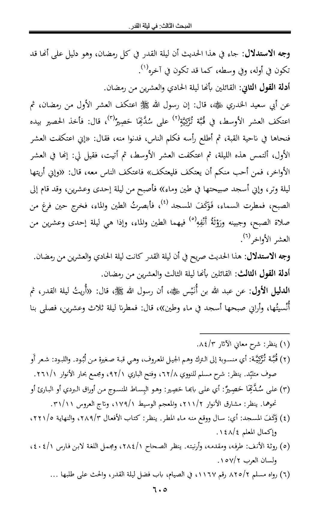 وجه الاستدلال: هذا الحديث صريح في أن ليلة القدر كانت ليلة الحادي والعشرين من رمضان.