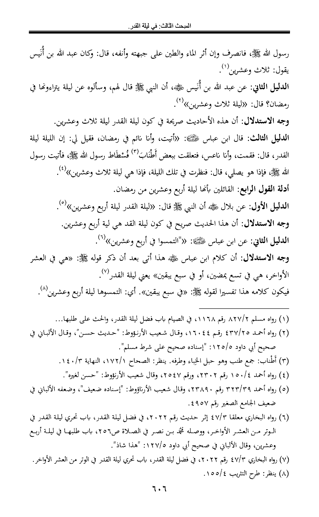 (¬6) رواه البخاري معلقا 3/ 47 إثر حديث رقم 2022, في فضل ليلة القدر، باب تحري ليلة القدر في الوتر من العشر الأواخر, ووصله محمد بن نصر في الصلاة ص 256, باب طلبها في ليلة أربع وعشرين, وقال الألباني في صحيح أبي داود 5/ 127: "هذا شاذ".