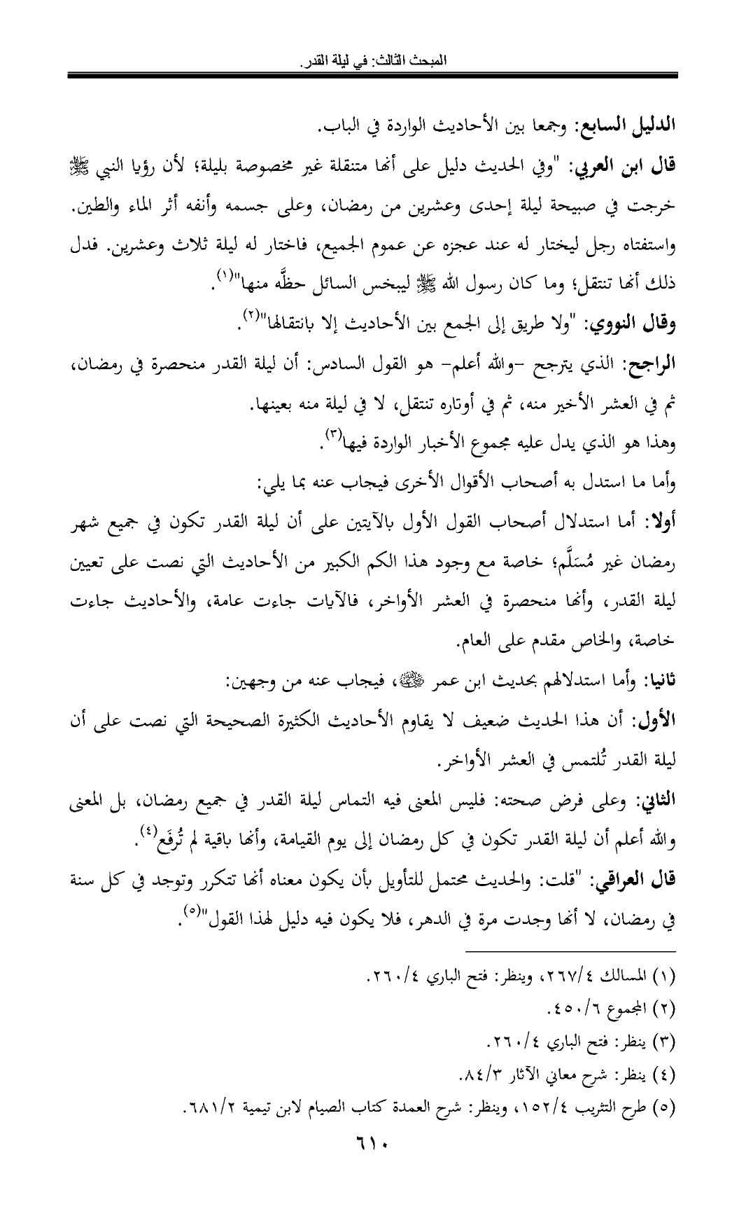 قال ابن العربي: "وفي الحديث دليل على أنها متنقلة غير مخصوصة بليلة؛ لأن رؤيا النبي - صلى الله عليه وسلم - خرجت في صبيحة ليلة إحدى وعشرين من رمضان، وعلى جسمه وأنفه أثر الماء والطين. واستفتاه رجل ليختار له عند عجزه عن عموم الجميع، فاختار له ليلة ثلاث وعشرين. فدل ذلك أنها تنتقل؛ وما كان رسول الله - صلى الله عليه وسلم - ليبخس السائل حظَّه منها" (¬1).