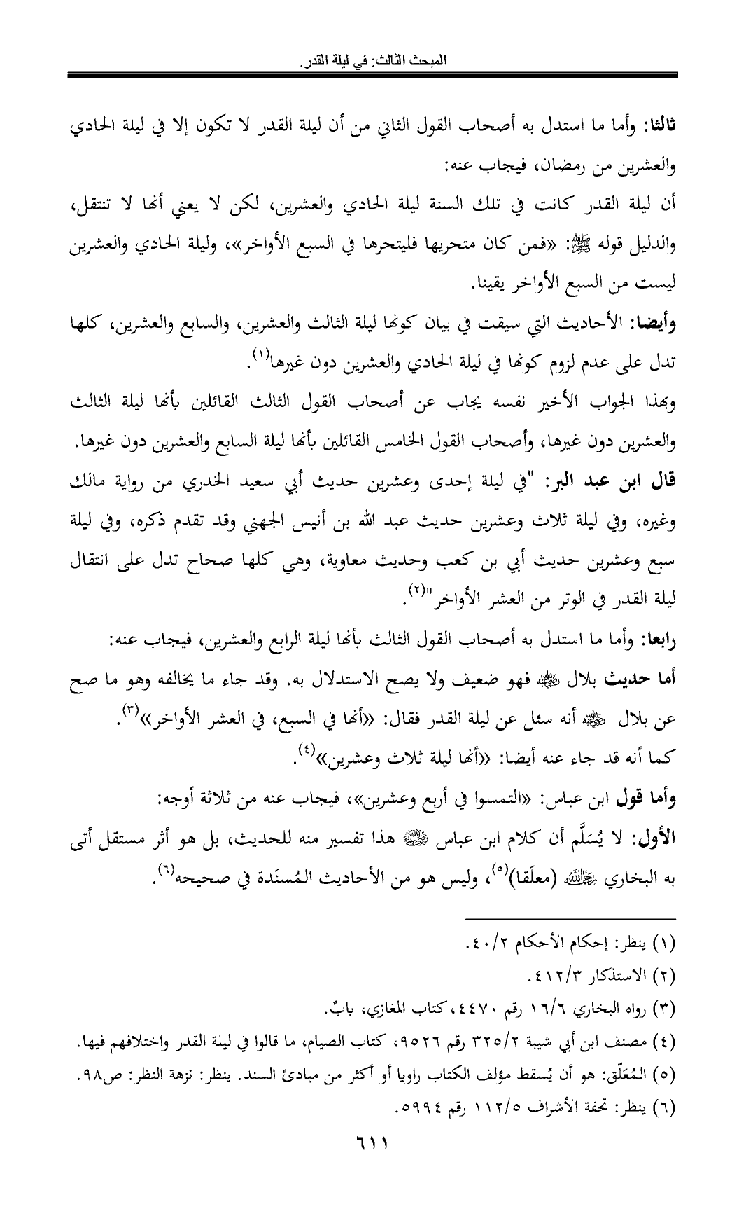 وبهذا الجواب الأخير نفسه يجاب عن أصحاب القول الثالث القائلين بأنها ليلة الثالث والعشرين دون غيرها، وأصحاب القول الخامس القائلين بأنها ليلة السابع والعشرين دون غيرها.