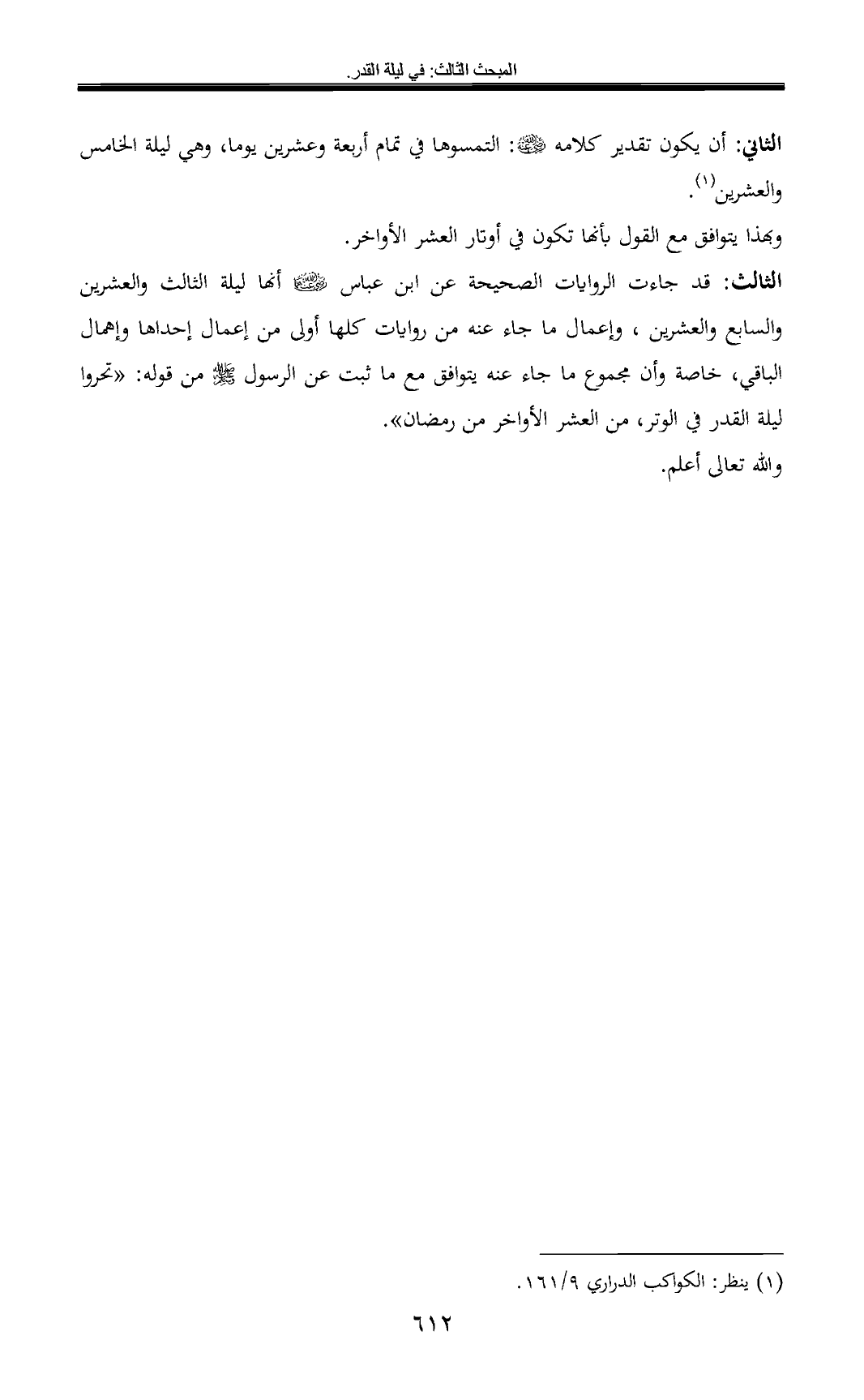 الثالث: قد جاءت الروايات الصحيحة عن ابن عباس - رضي الله عنهما - أنها ليلة الثالث والعشرين والسابع والعشرين، وإعمال ما جاء عنه من روايات كلها أولى من إعمال إحداها وإهمال الباقي, خاصة وأن مجموع ما جاء عنه يتوافق مع ما ثبت عن الرسول - صلى الله عليه وسلم - من قوله: «تحروا ليلة القدر في الوتر، من العشر الأواخر من رمضان».