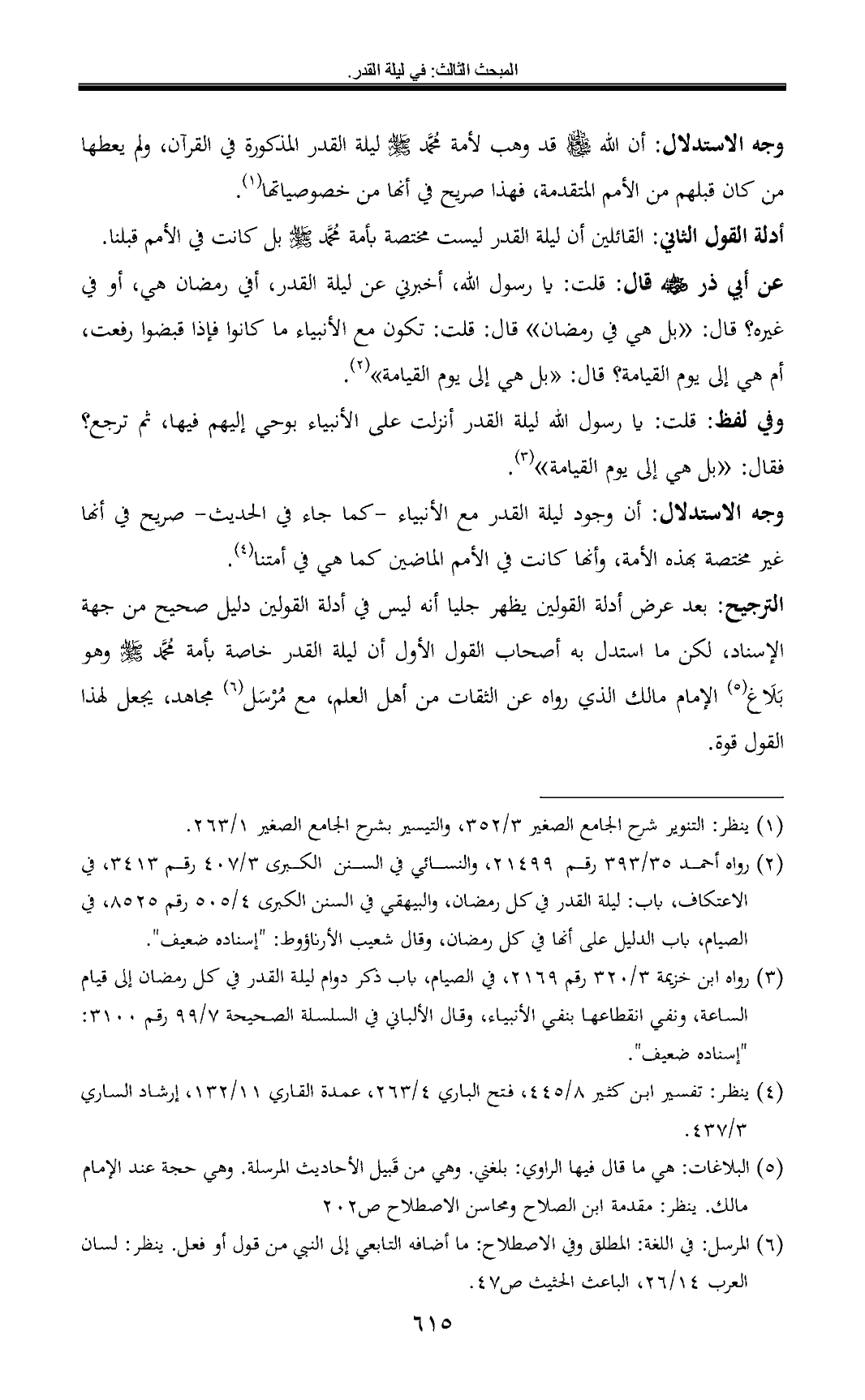 الترجيح: بعد عرض أدلة القولين يظهر جليا أنه ليس في أدلة القولين دليل صحيح من جهة الإسناد، لكن ما استدل به أصحاب القول الأول أن ليلة القدر خاصة بأمة محمد - صلى الله عليه وسلم - وهو بَلَاغ (¬5) الإمام مالك الذي رواه عن الثقات من أهل العلم, مع مُرْسَل (¬6) مجاهد, يجعل لهذا القول قوة.