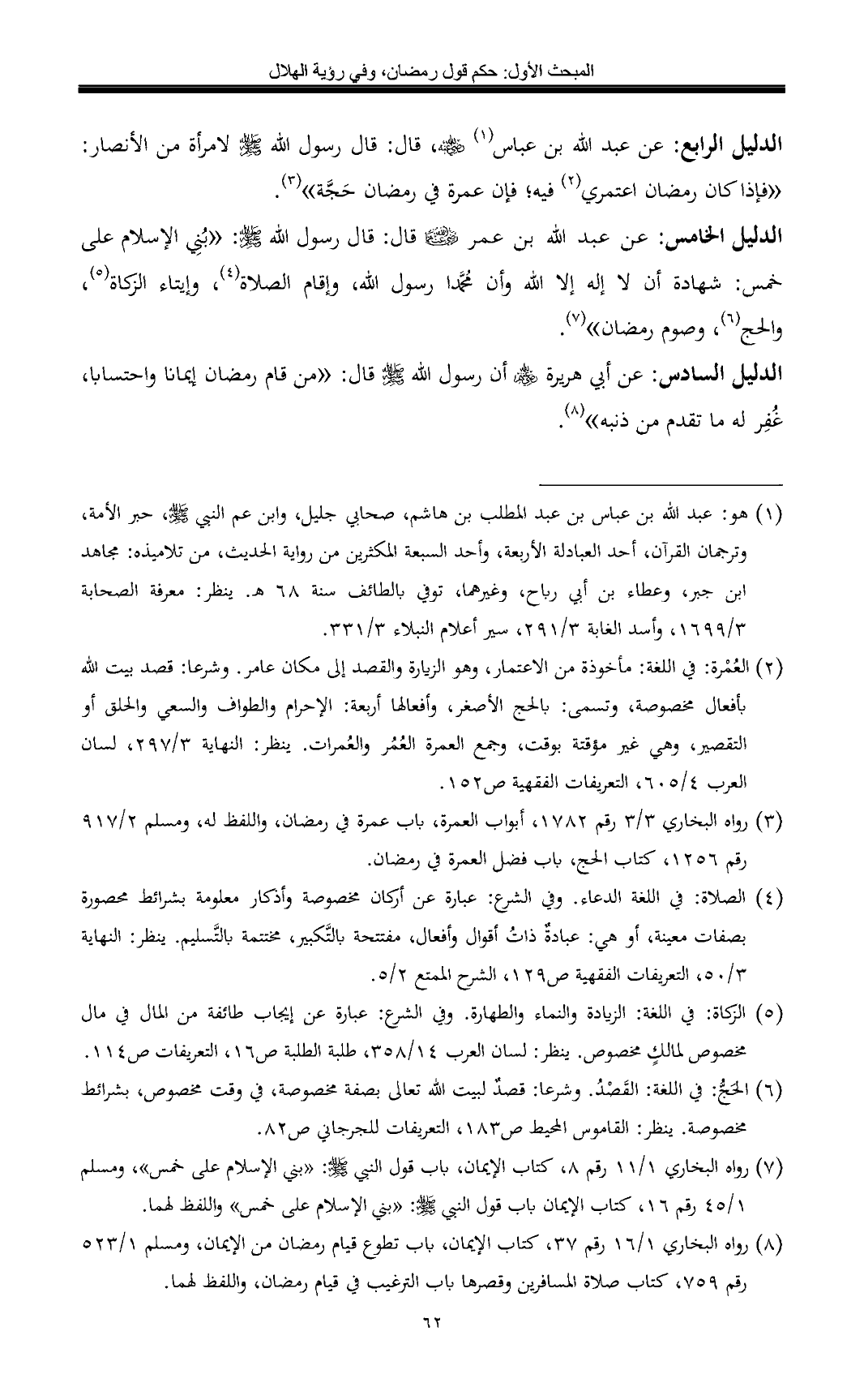 (¬7) رواه البخاري 1/ 11 رقم 8, كتاب الإيمان, باب قول النبي - صلى الله عليه وسلم -: «بني الإسلام على خمس»، ومسلم 1/ 45 رقم 16, كتاب الإيمان باب قول النبي - صلى الله عليه وسلم -: «بني الإسلام على خمس» واللفظ لهما.