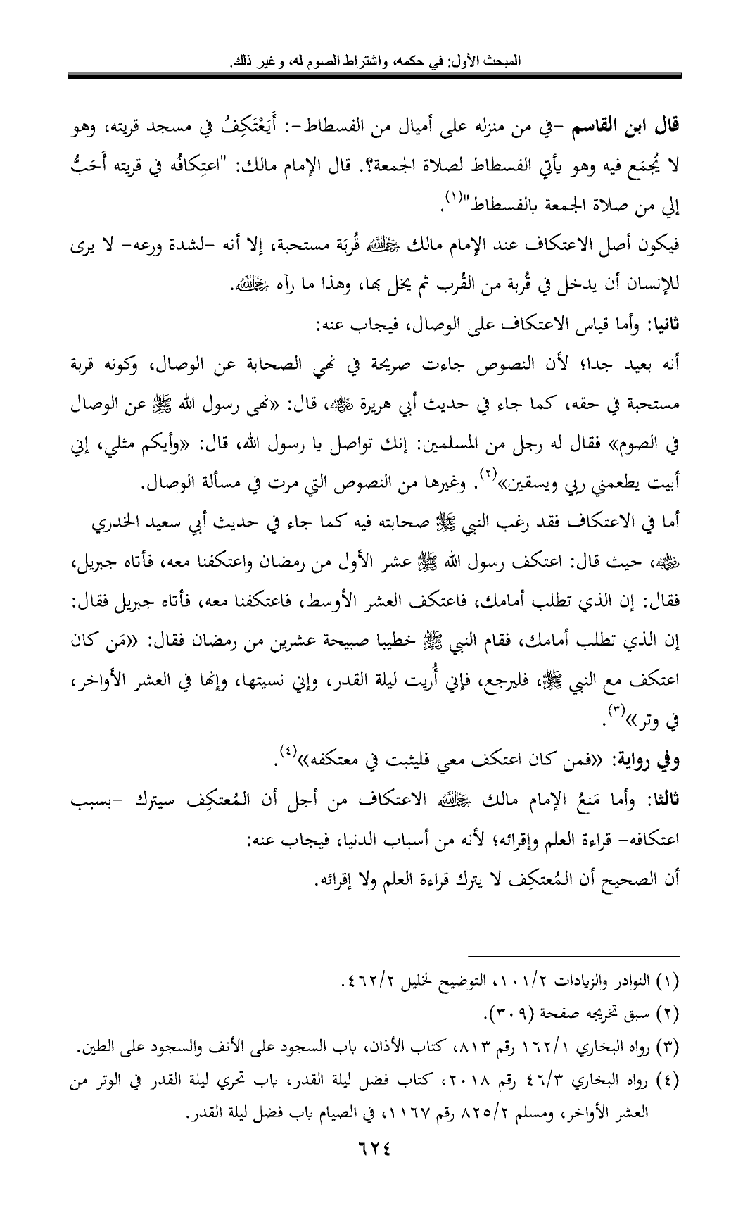 ثالثا: وأما مَنعُ الإمام مالك الاعتكاف من أجل أن المُعتكِف سيترك -بسبب اعتكافه- قراءة العلم وإقرائه؛ لأنه من أسباب الدنيا، فيجاب عنه: