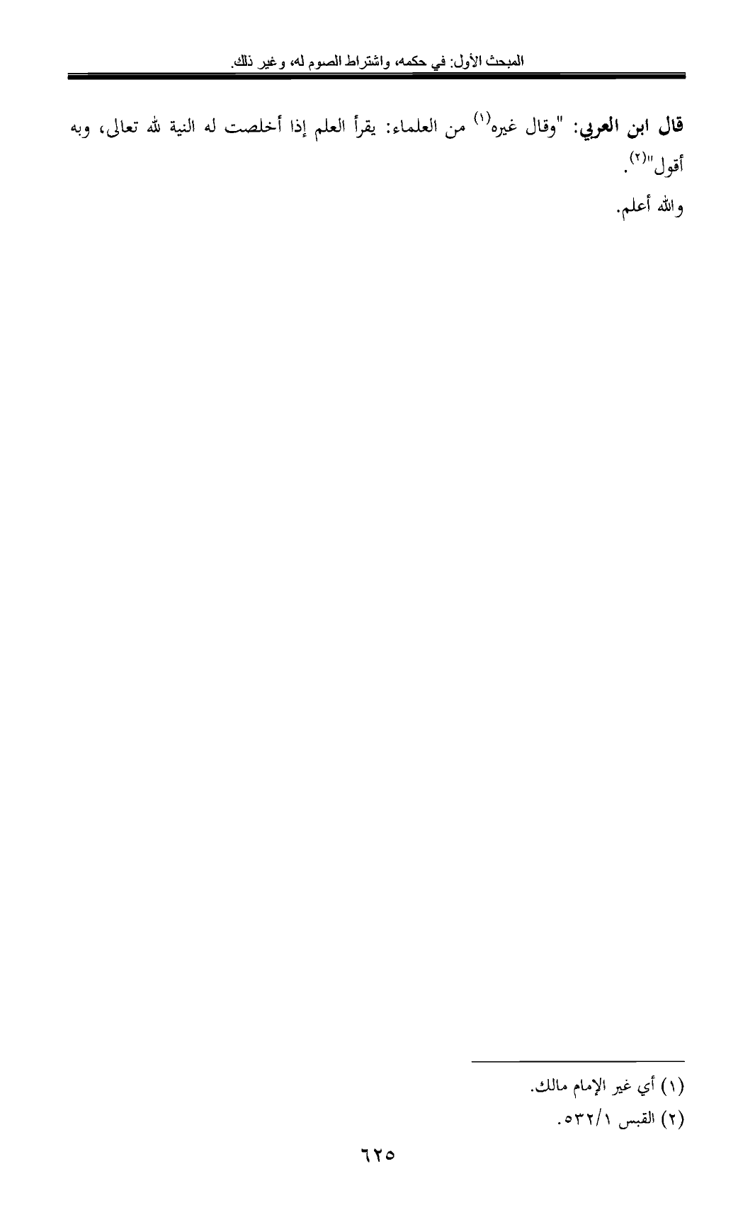 قال ابن العربي: "وقال غيره (¬1) من العلماء: يقرأ العلم إذا أخلصت له النية لله تعالى، وبه أقول" (¬2).
