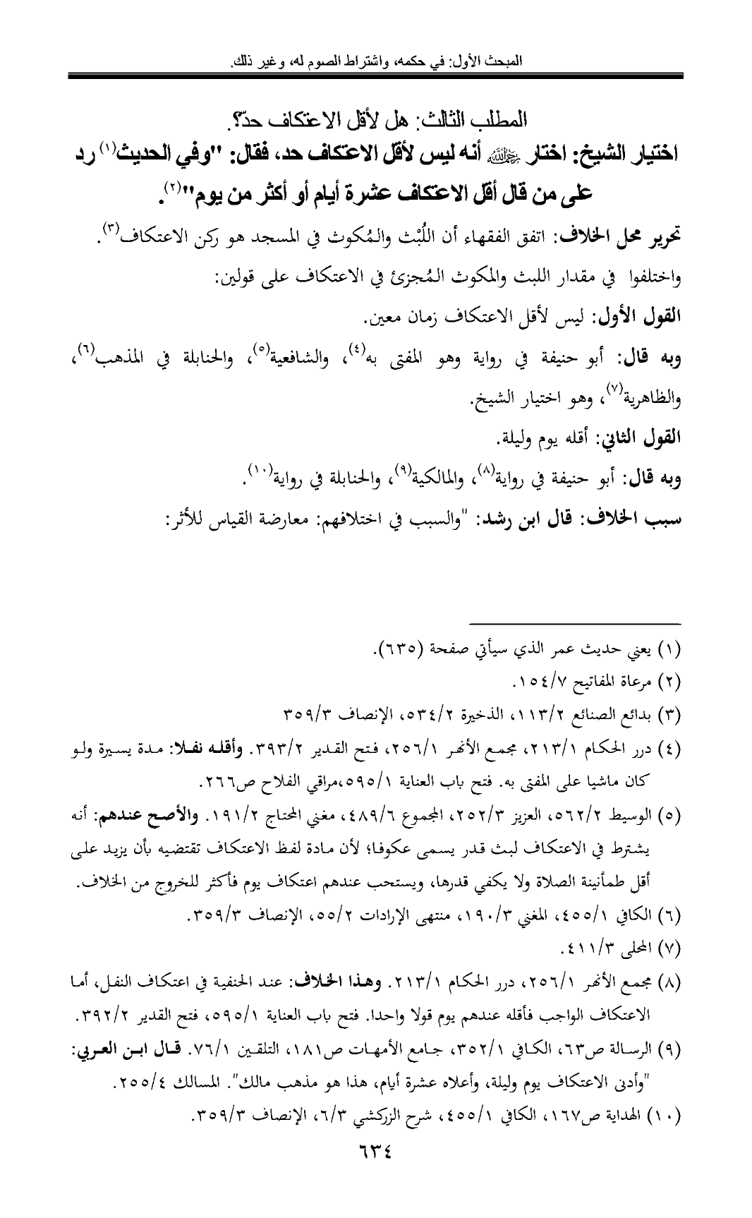 (¬8) مجمع الأنهر 1/ 256, درر الحكام 1/ 213. وهذا الخلاف: عند الحنفية في اعتكاف النفل, أما الاعتكاف الواجب فأقله عندهم يوم قولا واحدا. فتح باب العناية 1/ 595، فتح القدير 2/ 392.