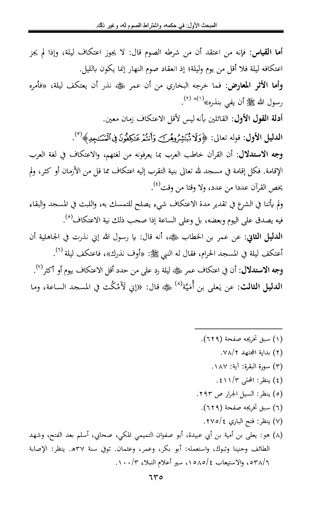 وجه الاستدلال: أن القرآن خاطب العرب بما يعرفونه من لغتهم، والاعتكاف في لغة العرب الإقامة. فكل إقامة في مسجد لله تعالى بنية التقرب إليه اعتكاف مما قل من الأزمان أو كثر، ولم يخص القرآن عددا من عدد، ولا وقتا من وقت (¬4).