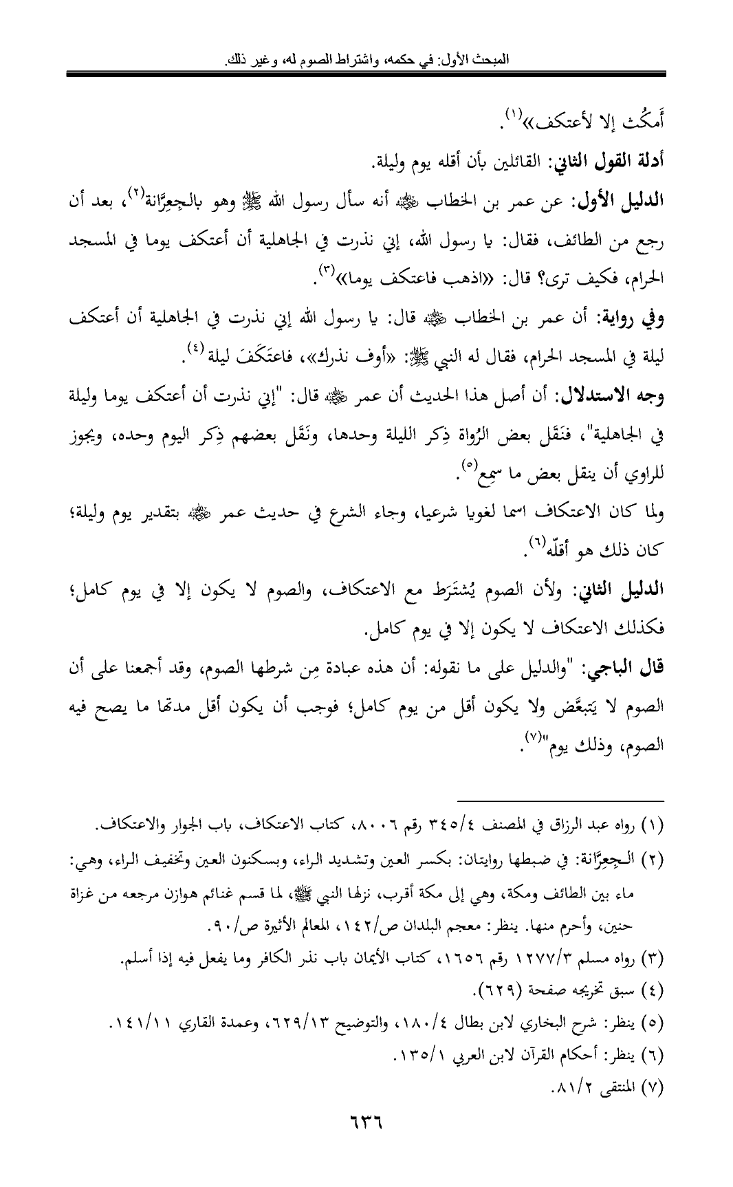 ولما كان الاعتكاف اسما لغويا شرعيا، وجاء الشرع في حديث عمر - رضي الله عنه - بتقدير يوم وليلة؛ كان ذلك هو أقلّه (¬6).