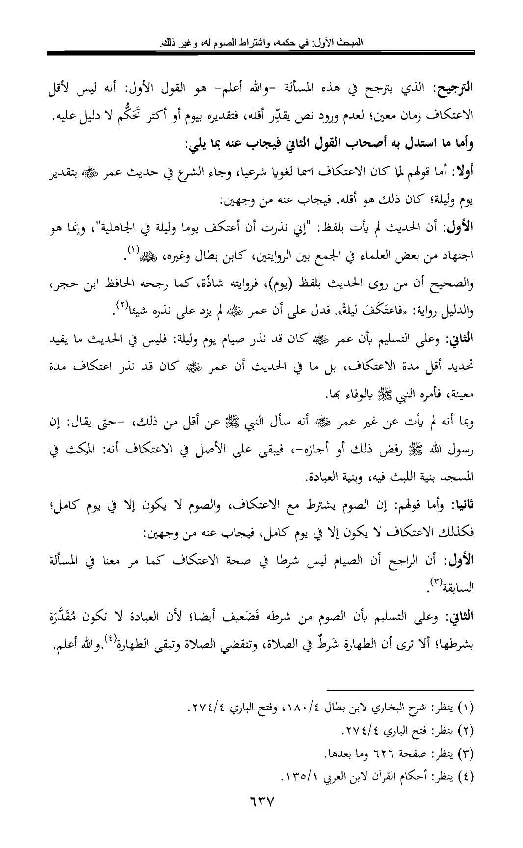 أولا: أما قولهم لمّا كان الاعتكاف اسما لغويا شرعيا، وجاء الشرع في حديث عمر - رضي الله عنه - بتقدير يوم وليلة؛ كان ذلك هو أقله. فيجاب عنه من وجهين: