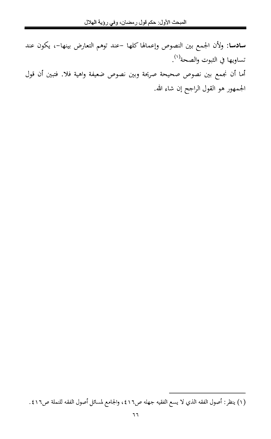 (¬1) ينظر: أصول الفقه الذي لا يسع الفقيه جهله ص 416، والجامع لمسائل أصول الفقه للنملة ص 416.