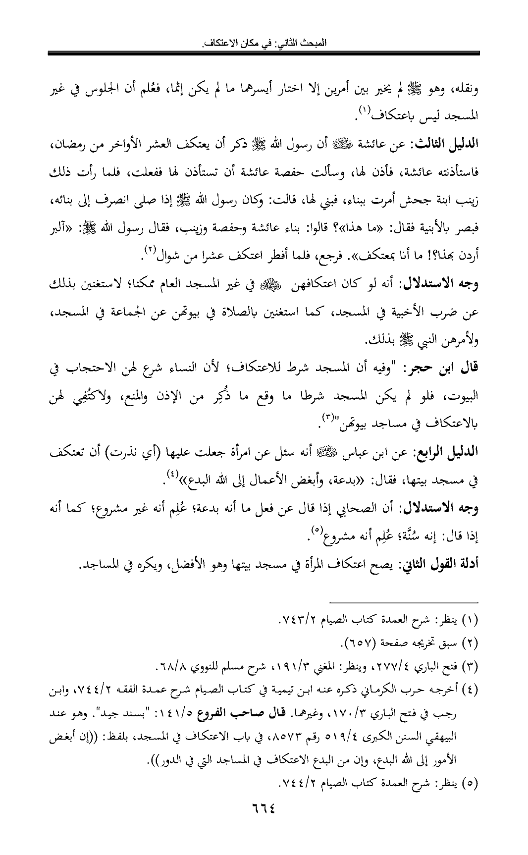 الدليل الثالث: عن عائشة - رضي الله عنها - أن رسول الله - صلى الله عليه وسلم - ذكر أن يعتكف العشر الأواخر من رمضان، فاستأذنته عائشة، فأذن لها، وسألت حفصة عائشة أن تستأذن لها ففعلت، فلما رأت ذلك زينب ابنة جحش أمرت ببناء، فبني لها، قالت: وكان رسول الله - صلى الله عليه وسلم - إذا صلى انصرف إلى بنائه، فبصر بالأبنية فقال: «ما هذا»؟ قالوا: بناء عائشة وحفصة وزينب، فقال رسول الله - صلى الله عليه وسلم -: «آلبر أردن بهذا؟ ! ما أنا بمعتكف». فرجع، فلما أفطر اعتكف عشرا من شوال (¬2).