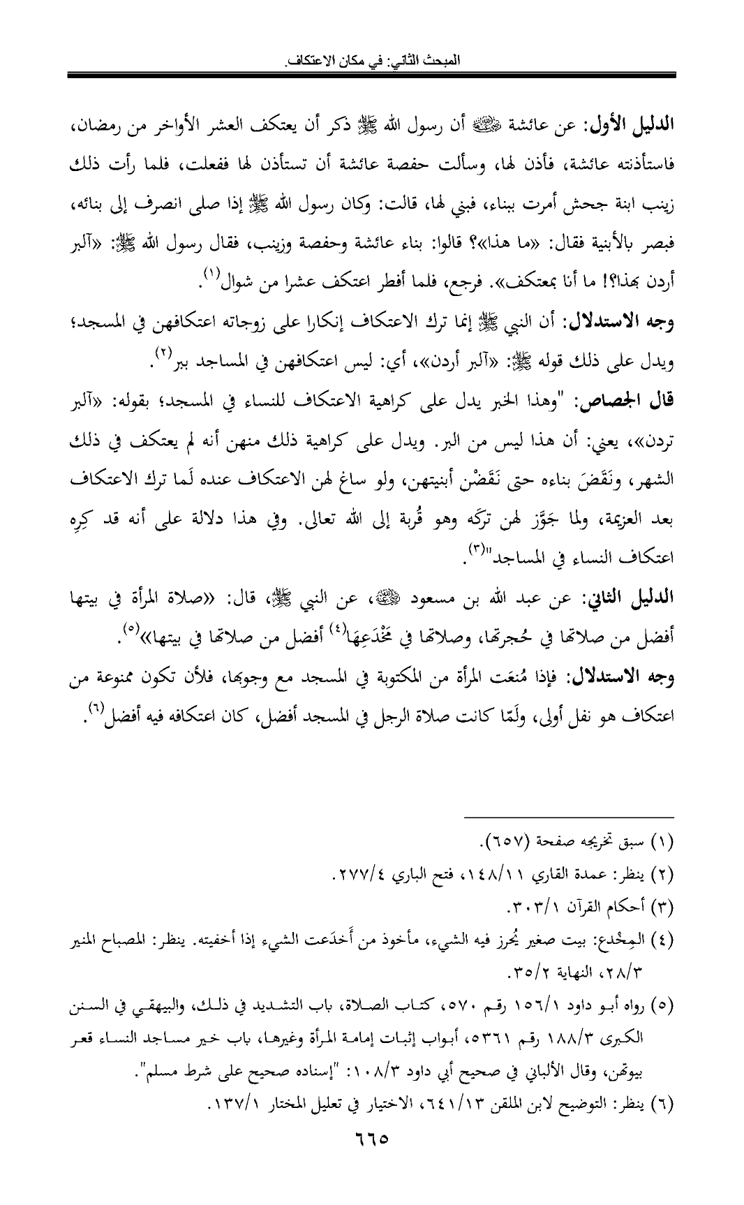 وجه الاستدلال: أن النبي - صلى الله عليه وسلم - إنما ترك الاعتكاف إنكارا على زوجاته اعتكافهن في المسجد؛ ويدل على ذلك قوله - صلى الله عليه وسلم -: «آلبر أردن» , أي: ليس اعتكافهن في المساجد ببر (¬2).