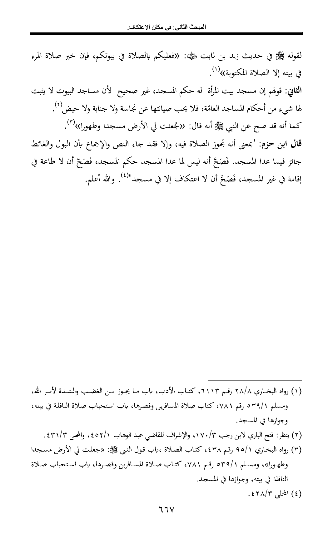 الثاني: قولهم إن مسجد بيت المرأة له حكم المسجد، غير صحيح لأن مساجد البيوت لا يثبت لها شيء من أحكام المساجد العامّة، فلا يجب صيانتها عن نجاسة ولا جنابة ولا حيض (¬2).
