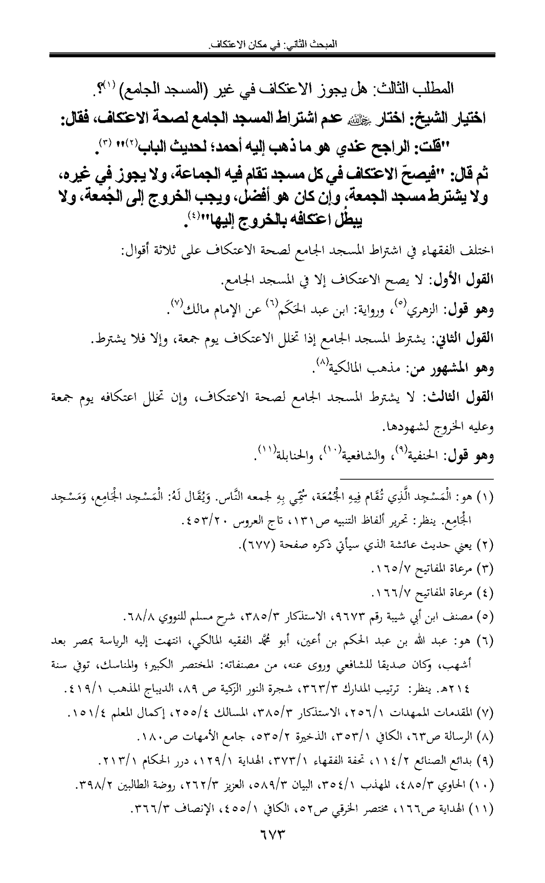 اختيار الشيخ: اختار عدم اشتراط المسجد الجامع لصحة الاعتكاف، فقال: "قلت: الراجح عندي هو ما ذهب إليه أحمد؛ لحديث الباب (¬2) " (¬3).