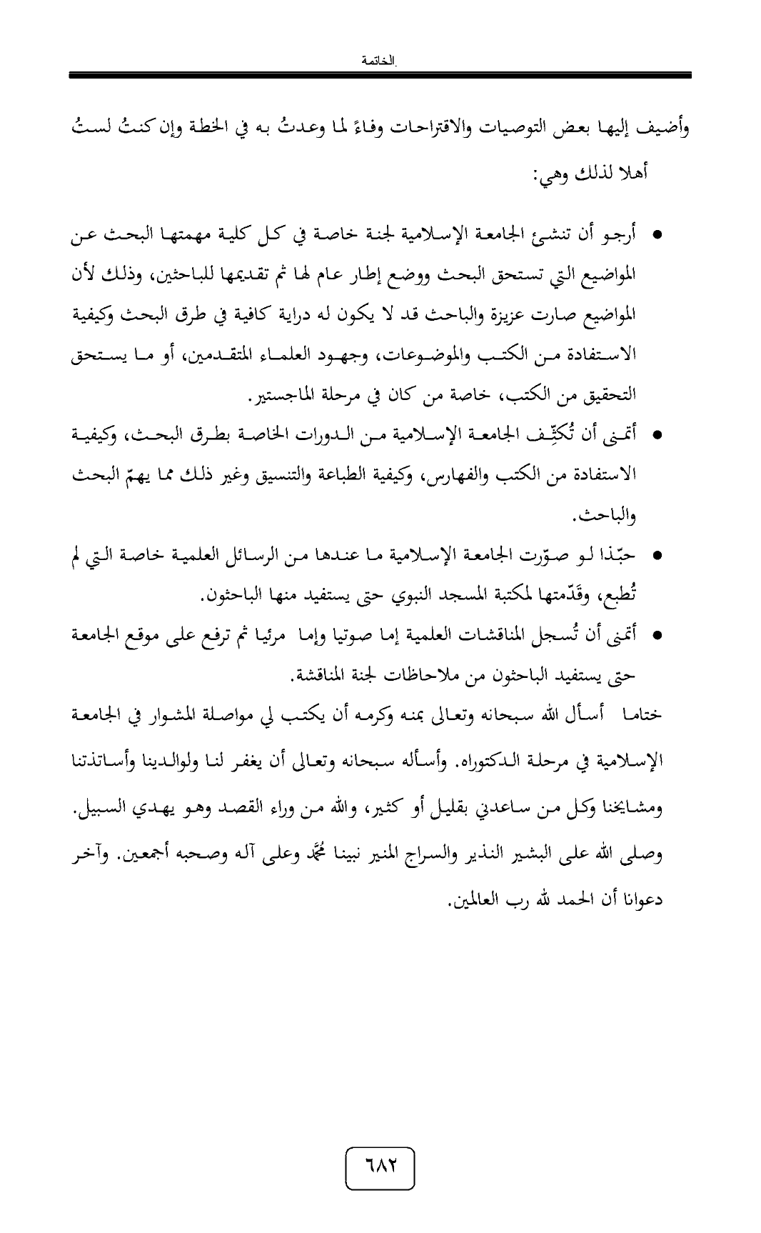 - حبّذا لو صوّرت الجامعة الإسلامية ما عندها من الرسائل العلمية خاصة التي لم تُطبع، وقَدّمتها لمكتبة المسجد النبوي حتى يستفيد منها الباحثون.