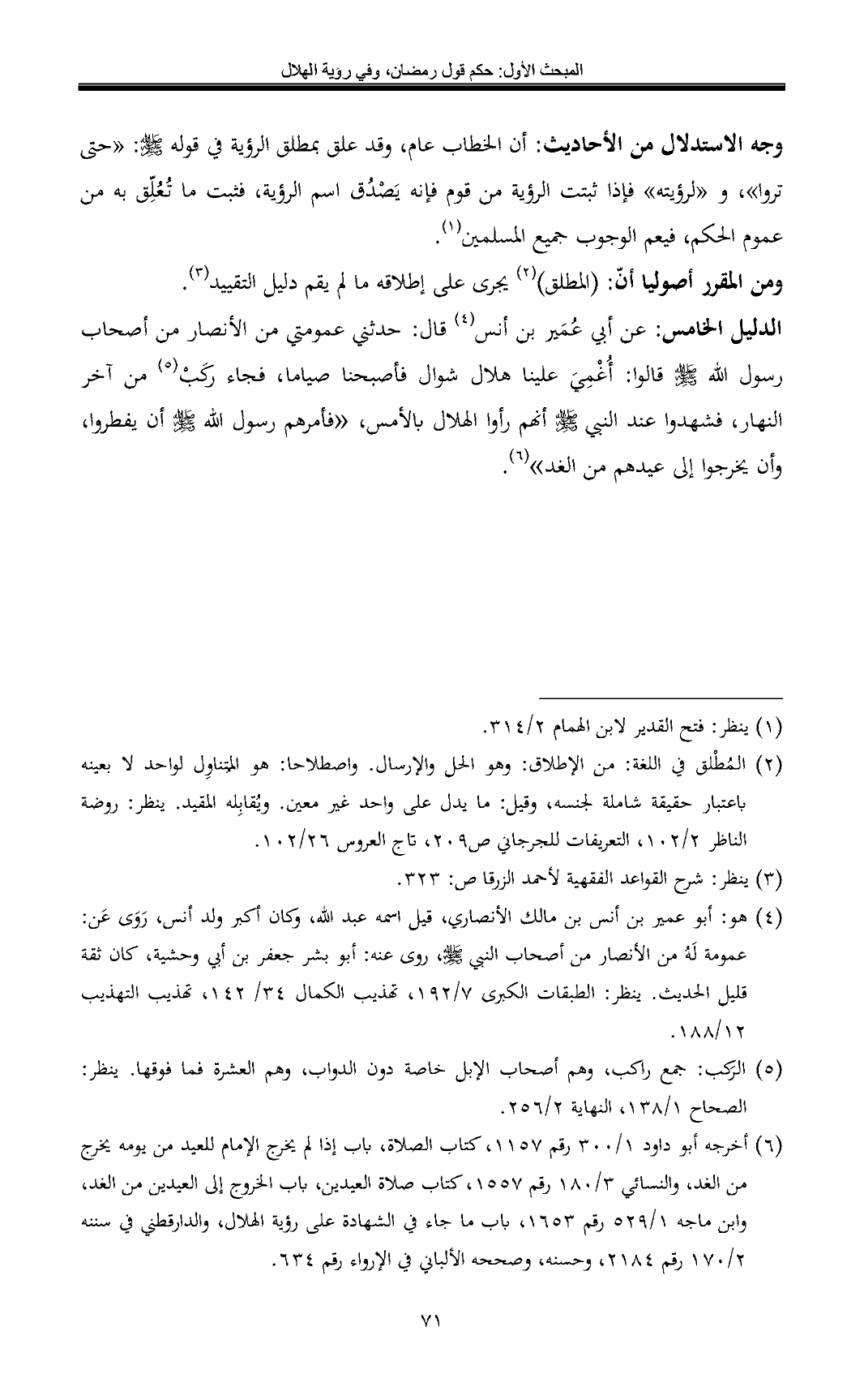 الدليل الخامس: عن أبي عُمَير بن أنس (¬4) قال: حدثني عمومتي من الأنصار من أصحاب رسول الله - صلى الله عليه وسلم - قالوا: أُغْمِيَ علينا هلال شوال فأصبحنا صياما، فجاء ركَبْ (¬5) من آخر النهار, فشهدوا عند النبي - صلى الله عليه وسلم - أنهم رأوا الهلال بالأمس، «فأمرهم رسول الله - صلى الله عليه وسلم - أن يفطروا، وأن يخرجوا إلى عيدهم من الغد» (¬6).