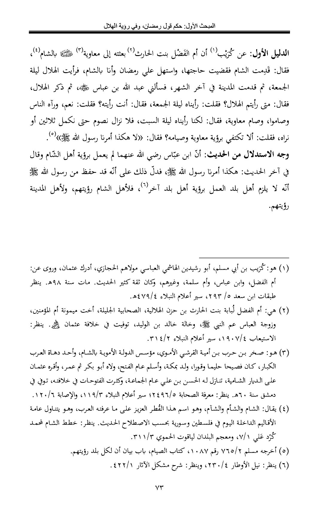 الدليل الأول: عن كُرَيْب (¬1) أن أم الفَضْل بنت الحارث (¬2) بعثته إلى معاوية (¬3) - رضي الله عنهما - بالشام (¬4)،