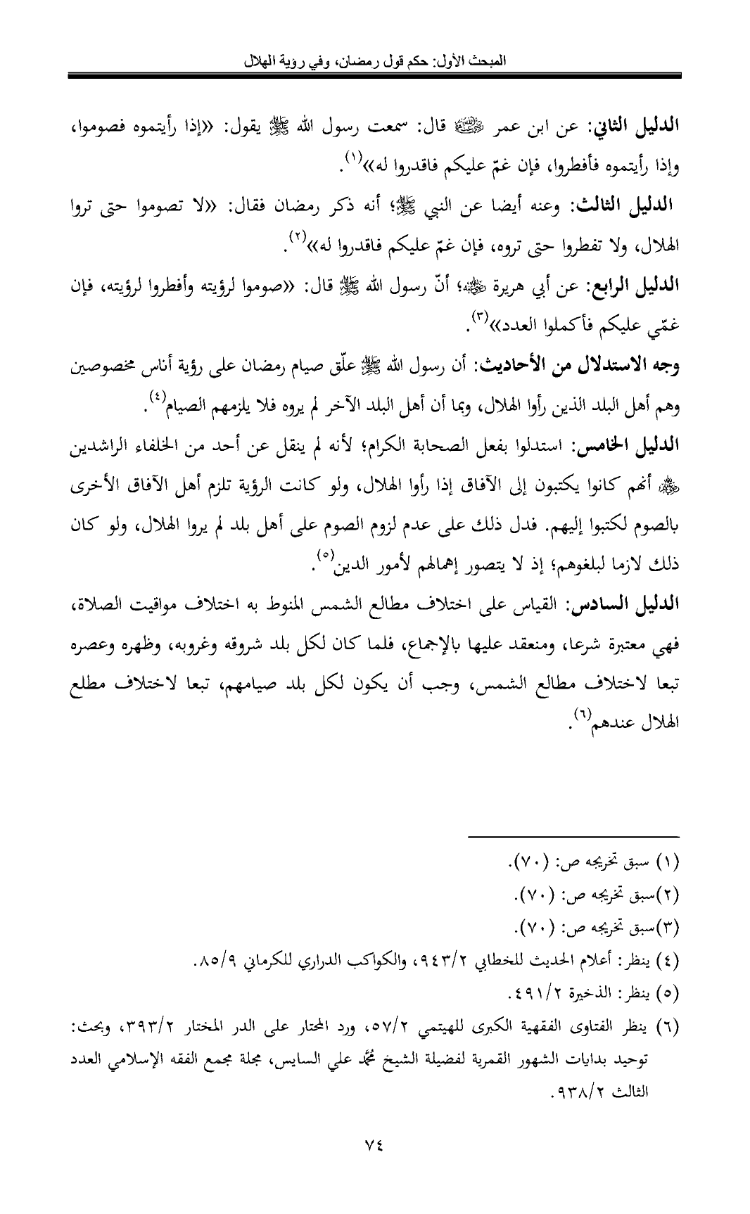 (¬6) ينظر الفتاوى الفقهية الكبرى للهيتمي 2/ 57، ورد المحتار على الدر المختار 2/ 393، وبحث: توحيد بدايات الشهور القمرية لفضيلة الشيخ محمد علي السايس, مجلة مجمع الفقه الإسلامي العدد الثالث 2/ 938.