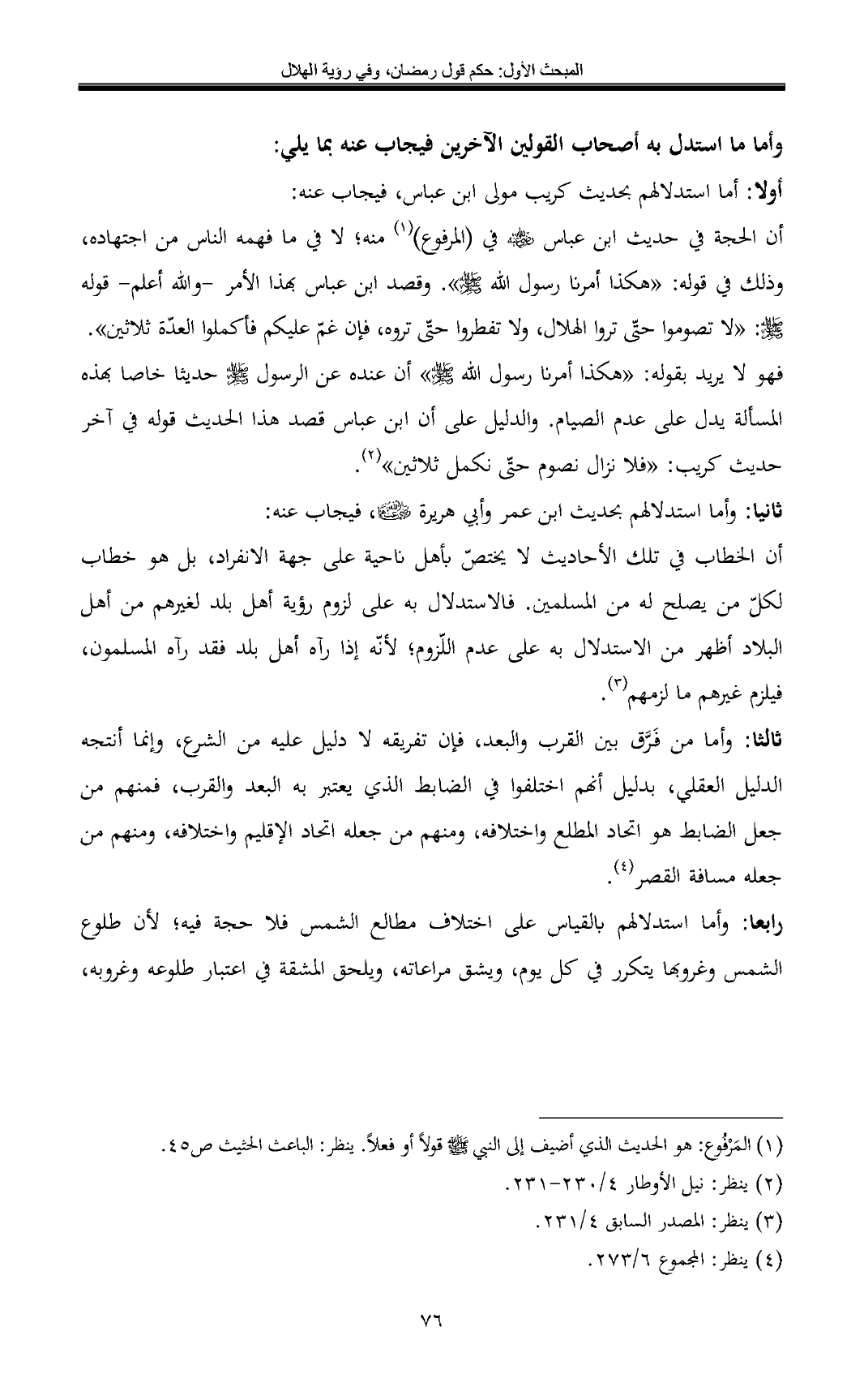 رابعا: وأما استدلالهم بالقياس على اختلاف مطالع الشمس فلا حجة فيه؛ لأن طلوع الشمس وغروبها يتكرر في كل يوم، ويشق مراعاته، ويلحق المشقة في اعتبار طلوعه وغروبه،