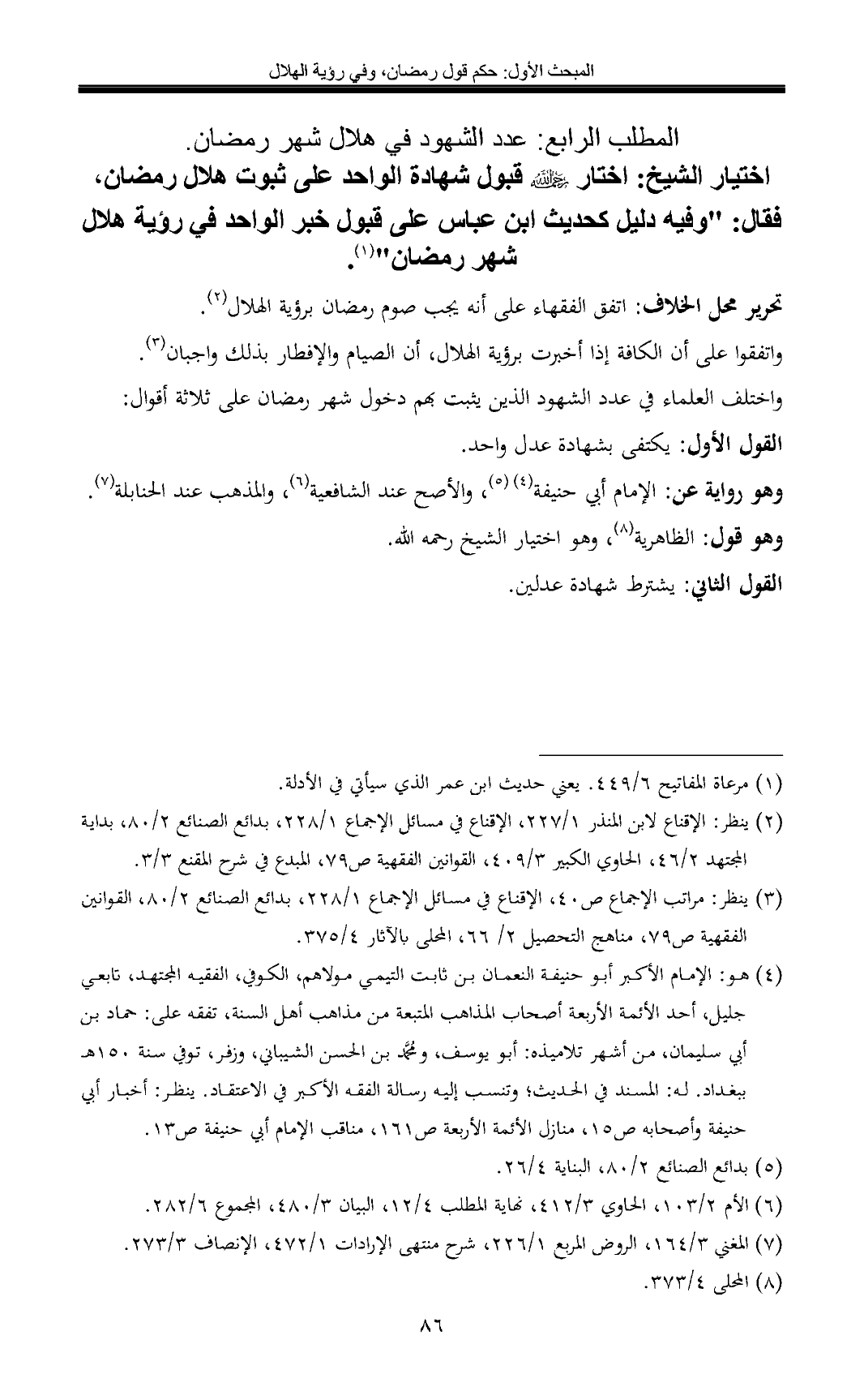 اختيار الشيخ: اختار قبول شهادة الواحد على ثبوت هلال رمضان، فقال: "وفيه دليل كحديث ابن عباس على قبول خبر الواحد في رؤية هلال شهر رمضان" (¬1).