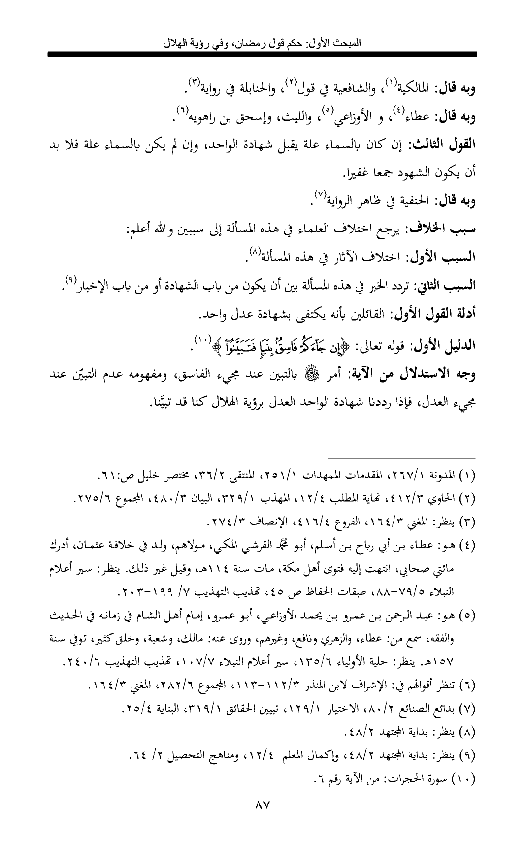 وجه الاستدلال من الآية: أمر سبحانه وتعالى بالتبين عند مجيء الفاسق، ومفهومه عدم التبيّن عند مجيء العدل، فإذا رددنا شهادة الواحد العدل برؤية الهلال كنا قد تبيَّنا.