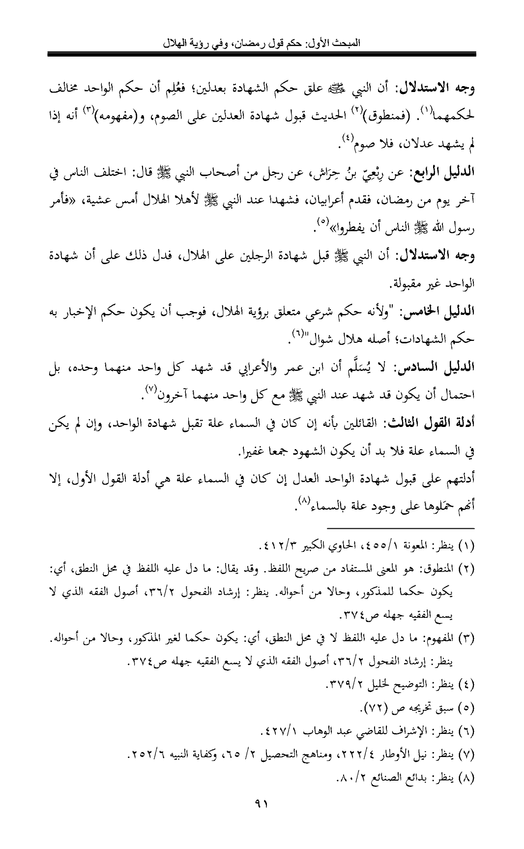وجه الاستدلال: أن النبي - صلى الله عليه وسلم - علق حكم الشهادة بعدلين؛ فعُلِم أن حكم الواحد مخالف لحكمهما (¬1). (فمنطوق) (¬2) الحديث قبول شهادة العدلين على الصوم، و (مفهومه) (¬3) أنه إذا لم يشهد عدلان، فلا صوم (¬4).