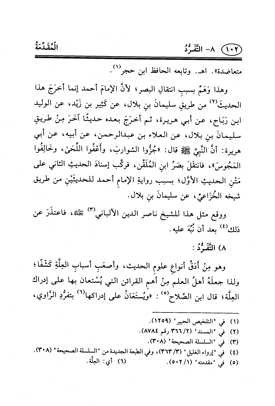 وهذا وَهَمٌ بسببِ انتقالِ البصر؛ لأنَّ الإمامَ أحمد إنما أخرَجَ هذا الحديثَ (٢) من طريقِ سليمانَ بنِ بلال، عَنْ كَثِير بْنِ زَيْد، عَنْ الوليد ابن رَبَاح، عن أبي هريرة، ثم أخرَجَ بعده حديثًا آخَرَ مِنْ طريقِ سليمانَ بنِ بلال، عن العلاء بن عبد الرحمن، عَنْ أَبِيهِ، عَنْ أَبِي هُرَيْرَةَ: أنَّ النَّبِيَّ (ص) قال: «جُزُّوا الشواربَ، وأَعْفُوا اللِّحَى، وخَالِفُوا المَجُوسَ» ، فانتقَلَ بصَرُ ابنِ المُلَقِّن، فركَّب إسنادَ الحديثِ الثاني على مَتْنِ الحديثِ الأوَّل؛ بسبب روايةِ الإمامِ أحمد للحديثَيْنِ من طريق شيخه الخُزَاعيِّ، عن سليمانَ بنِ بلال.