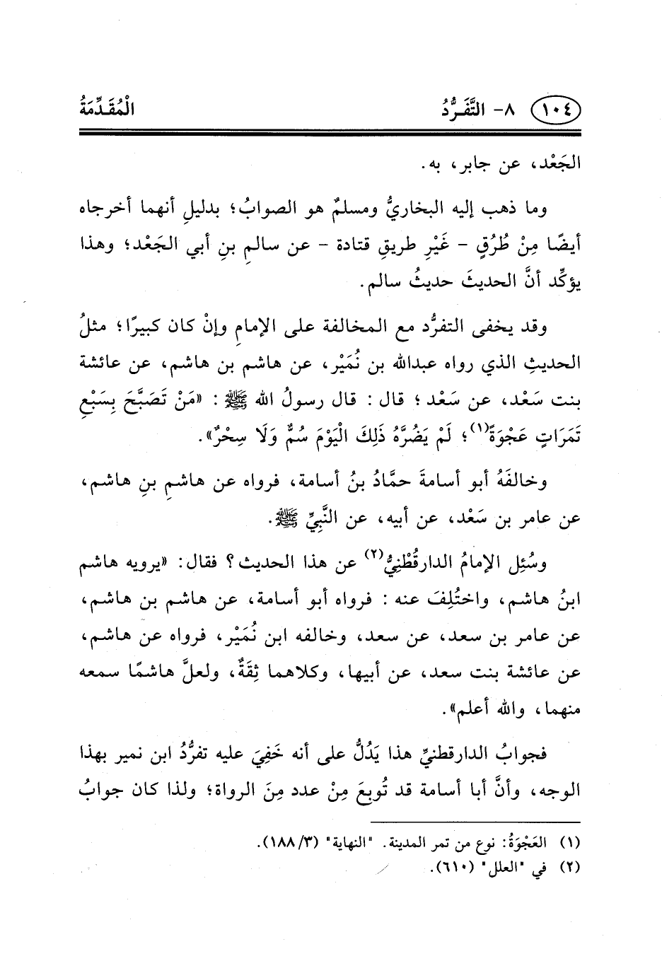 وقد يخفى التفرُّد مع المخالفة على الإمامِ وإنْ كان كبيرًا؛ مثلُ الحديثِ الذي رواه عبد الله ابن نُمَيْر، عَنْ هَاشِمِ بْنِ هَاشِمٍ، عَنْ عَائِشَةَ بِنْتِ سَعْد، عَنْ سَعْد؛ قَالَ: قَالَ رسولُ اللَّهِ (ص) : «مَنْ تَصَبَّحَ بِسَبْعِ تَمَرَاتٍ عَجْوَةً (١) ؛ لَمْ يَضُرَّهُ ذَلِكَ الْيَوْمَ سُمٌّ وَلَا سِحْرٌ» .