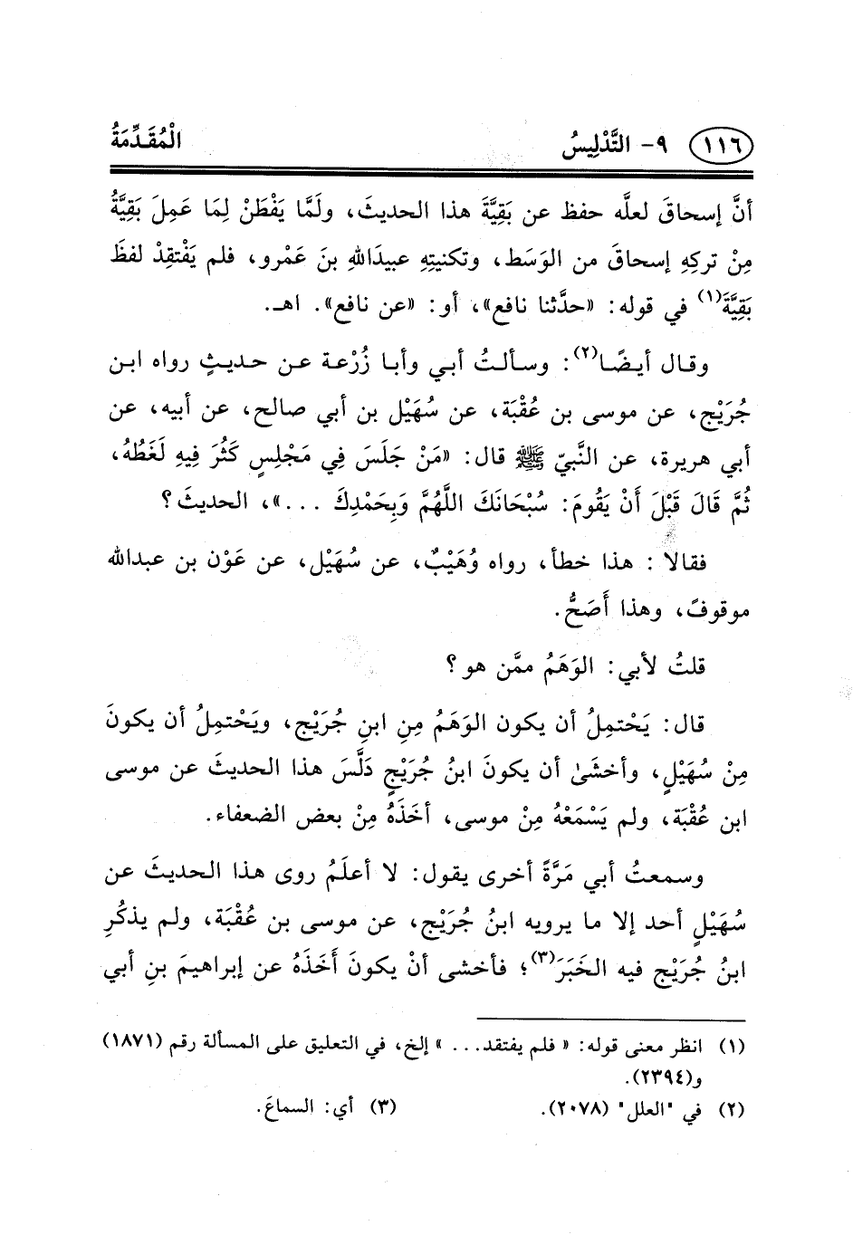 قَالَ: يَحْتمِلُ أَنْ يَكُونَ الوَهَمُ مِنِ ابنِ جُرَيْج، ويَحْتمِلُ أَنْ يكونَ مِنْ سُهَيْلٍ، وأخشَى أَنْ يكونَ ابنُ جُرَيْجٍ دَلَّسَ هَذَا الحديثَ عَنْ مُوسَى بْنِ عُقْبَة، وَلَمْ يَسْمَعْهُ مِنْ مُوسَى، أخَذَهُ مِنْ بَعْضِ الضِّعَفَاءِ.