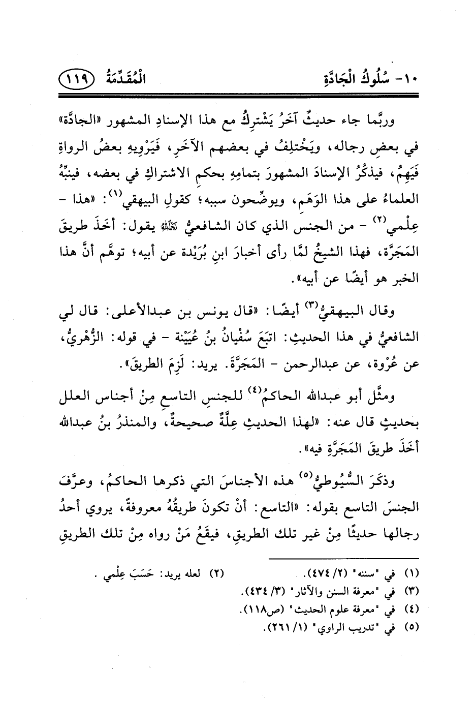 وربَّما جاء حديثٌ آخَرُ يَشْترِكُ مع هذا الإسنادِ المشهور «الجادَّة» في بعضِ رجاله، ويَخْتلِفُ في بعضهم الآخَرِ، فَيَرْوِيهِ بعضُ الرواةِ فَيَهِمُ، فيذكُرُ الإسنادَ المشهورَ بتمامِهِ بحكمِ الاشتراكِ في بعضه، فينبِّهُ العلماءُ على هذا الوَهَمِ، ويوضِّحون سببه؛ كقولِ البيهقي (١) : «هذا - عِلْمي (٢) - من الجنس الذي كان الشافعيُّ _ح يقول: أخَذَ طريقَ المَجَرَّة، فهذا الشيخُ لمَّا رأى أخبارَ ابنِ بُرَيْدة عن أبيه؛ توهَّم أنَّ هذا الخبر هو أيضًا عن أبيه» .