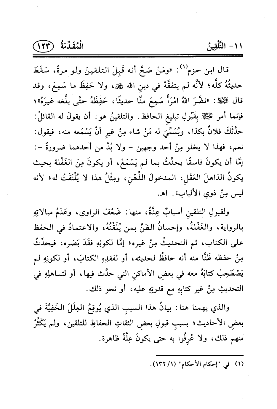 قال ابن حزم (١) : «ومَنْ صَحَّ أنه قَبِلَ التلقينَ ولو مرةً، سَقَطَ حديثُهُ كلُّه؛ لأنَّه لم يتفقَّهْ في دينِ الله ا، ولا حَفِظَ ما سَمِعَ، وقد قال _ج: «نضَّرَ اللهُ امْرَأً سَمِعَ منَّا حديثًا، حَفِظَهُ حتَّى بلَّغه غيرَهُ» ؛ فإنما أمر _ج بِقَبُولِ تبليغِ الحافظ. والتلقينُ هو: أن يقولَ له القائلُ: حدَّثَكَ فلانٌ بكذا، ويُسَمِّيَ له مَنْ شاء مِنْ غيرِ أنْ يَسْمَعه منه، فيقول: نعم، فهذا لا يخلو مِنْ أحد وجهين - ولا بُدَّ من أحدهما ضرورةً -: إمَّا أن يكونَ فاسقًا يحدِّثُ بما لم يَسْمَعْ، أو يكونَ مِنَ الغَفْلة بحيث يكونُ الذاهلَ العَقْلِ، المدخولَ الذِّهْنِ، ومِثْلُ هذا لا يُلْتَفَتُ له؛ لأنه ليس مِنْ ذوي الألباب» . اهـ.