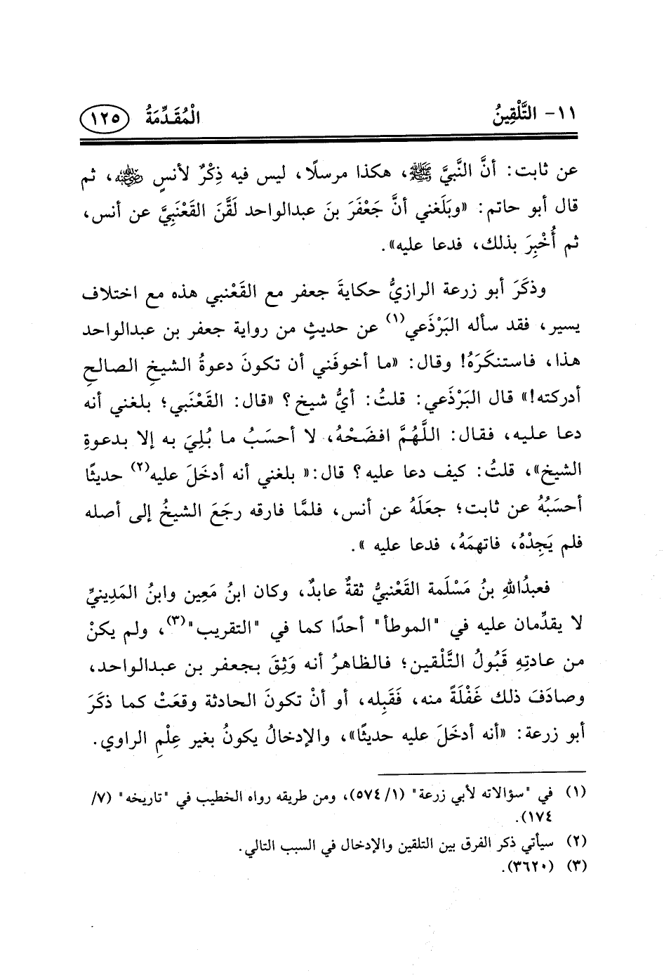 فعبدُاللهِ بنُ مَسْلَمة القَعْنبيُّ ثقةٌ عابدٌ، وكان ابنُ مَعِين وابنُ المَدِينيِّ لا يقدِّمان عليه في "الموطأ" أحدًا كما في "التقريب" (٣) ، ولم يكنْ من عادتِهِ قَبُولُ التَّلْقين؛ فالظاهرُ أنه وَثِقَ بجعفر بن عبد الواحد، وصادَفَ ذلك غَفْلَةً منه، فَقَبِله، أو أنْ تكونَ الحادثة وقعَتْ كما ذكَرَ أبو زرعة: «أنه أدخَلَ عليه حديثًا» ، والإدخالُ يكونُ بغير عِلْمِ الراوي.