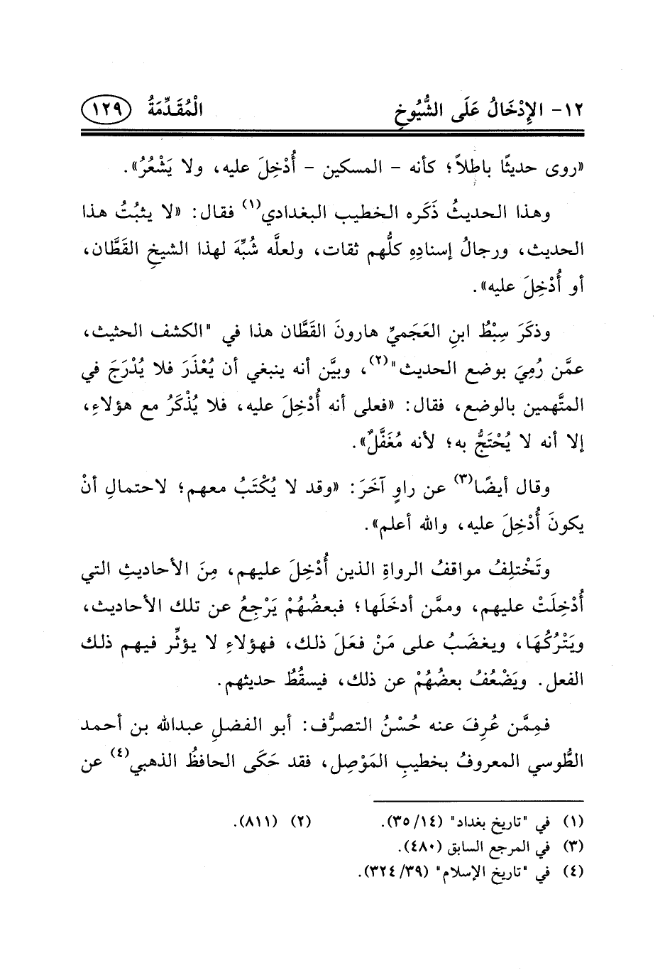 وذكَرَ سِبْطُ ابنِ العَجَميِّ هارونَ القَطَّان هذا في "الكشف الحثيث، عمَّن رُمِيَ بوضع الحديث" (٢) ، وبيَّن أنه ينبغي أن يُعْذَرَ فلا يُدْرَجَ في المتَّهمين بالوضع، فقال: «فعلى أنه أُدْخِلَ عليه، فلا يُذْكَرُ مع هؤلاءِ، إلا أنه لا يُحْتَجُّ به؛ لأنه مُغَفَّلٌ» .