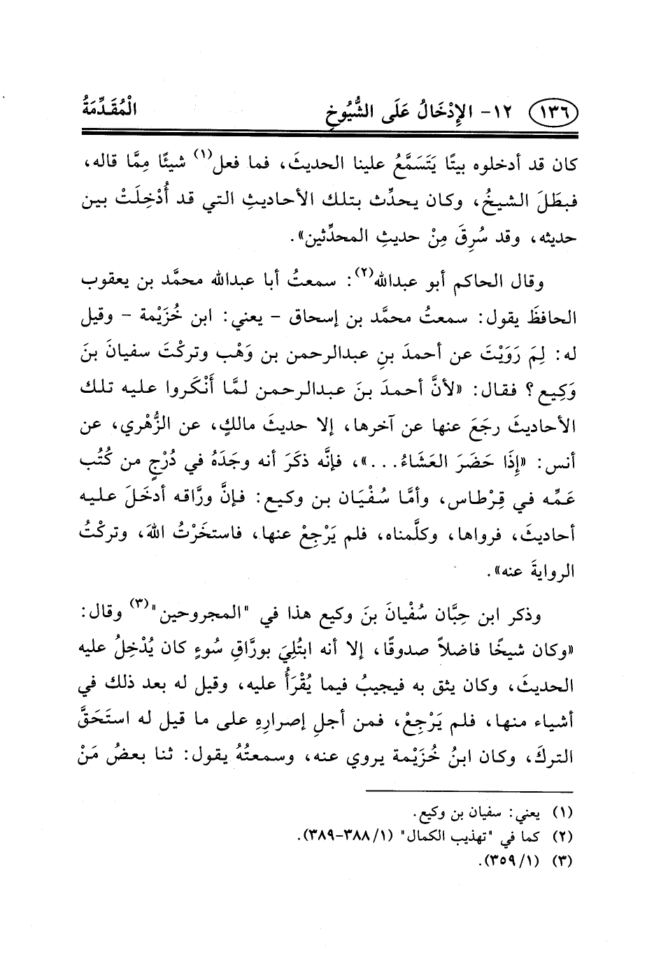 وقال الحاكم أبو عبد الله (٢) : سمعتُ أبا عبد الله محمَّد بن يعقوب الحافظَ يقول: سمعتُ محمَّد بن إسحاق - يعني: ابن خُزَيْمة - وقيل له: لِمَ رَوَيْتَ عن أحمدَ بنِ عبد الرحمن بن وَهْب وتركْتَ سفيانَ بنَ وَكِيع؟ فقال: «لأنَّ أحمدَ بنَ عبد الرحمن لمَّا أَنْكَروا عليه تلك الأحاديثَ رجَعَ عنها عن آخرها، إلا حديثَ مالكٍ، عَنِ الزُّهْري، عَنْ أنس: «إِذَا حَضَرَ العَشَاءُ ... » ، فإنَّه ذكَرَ أنه وجَدَهُ في دُرْجٍ من كُتُب عَمِّه في قِرْطاس، وأمَّا سُفْيَان بن وكيع: فإنَّ ورَّاقه أدخَلَ عليه أحاديثَ، فرواها، وكلَّمناه، فلم يَرْجِعْ عنها، فاستخَرْتُ اللهَ، وتركْتُ الروايةَ عنه» .